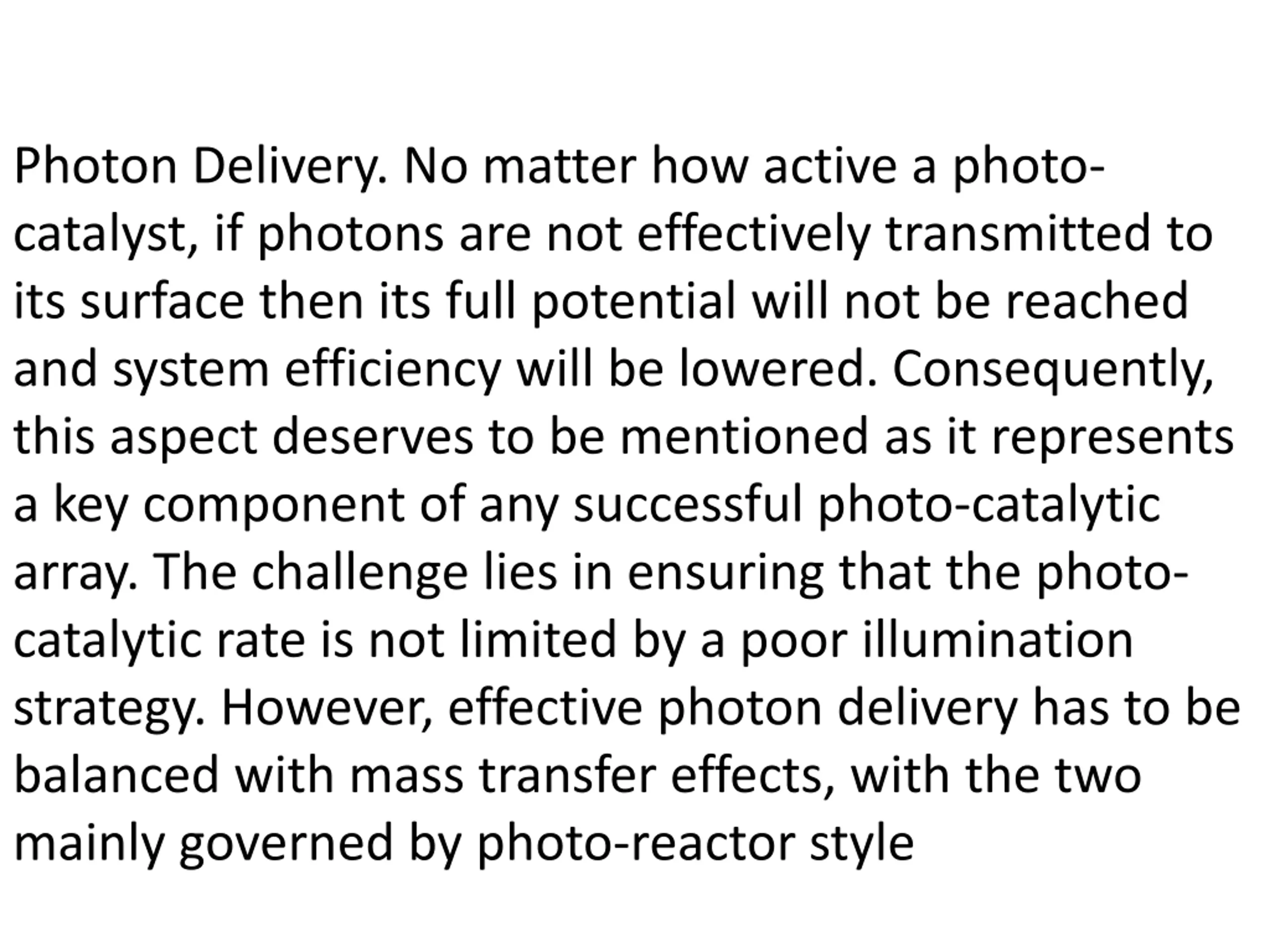 Photon Delivery. No matter how active a photo- catalyst, if photons are not effectively transmitted to its surface then its full potential will not be reached and system efficiency will be lowered. Consequently, this aspect deserves to be mentioned as it represents a key component of any successful photo-catalytic array. The challenge lies in ensuring that the photo- catalytic rate is not limited by a poor illumination strategy. However, effective photon delivery has to be balanced with mass transfer effects, with the two mainly governed by photo-reactor style