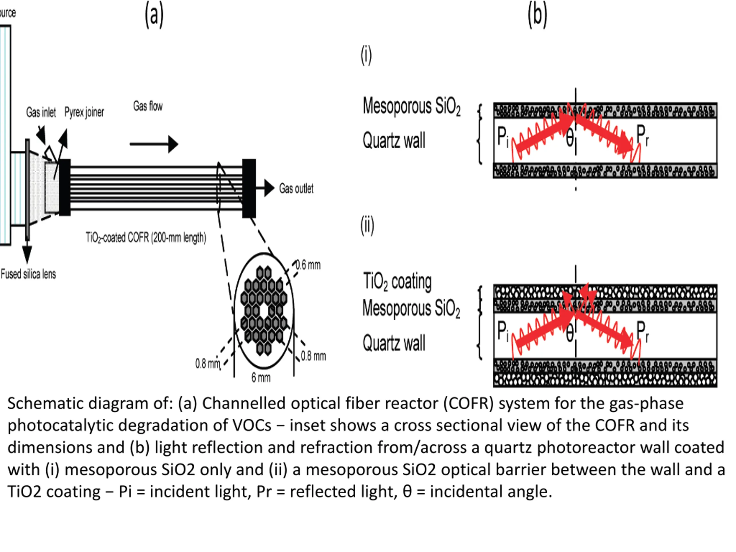 Schematic diagram of: (a) Channelled optical fiber reactor (COFR) system for the gas-phase photocatalytic degradation of VOCs inset shows a cross sectional view of the COFR and its dimensions and (b) light reflection and refraction from/across a quartz photoreactor wall coated with (i) mesoporous SiO2 only and (ii) a mesoporous SiO2 optical barrier between the wall and a TiO2 coating Pi = incident light, Pr = reflected light, = incidental angle.