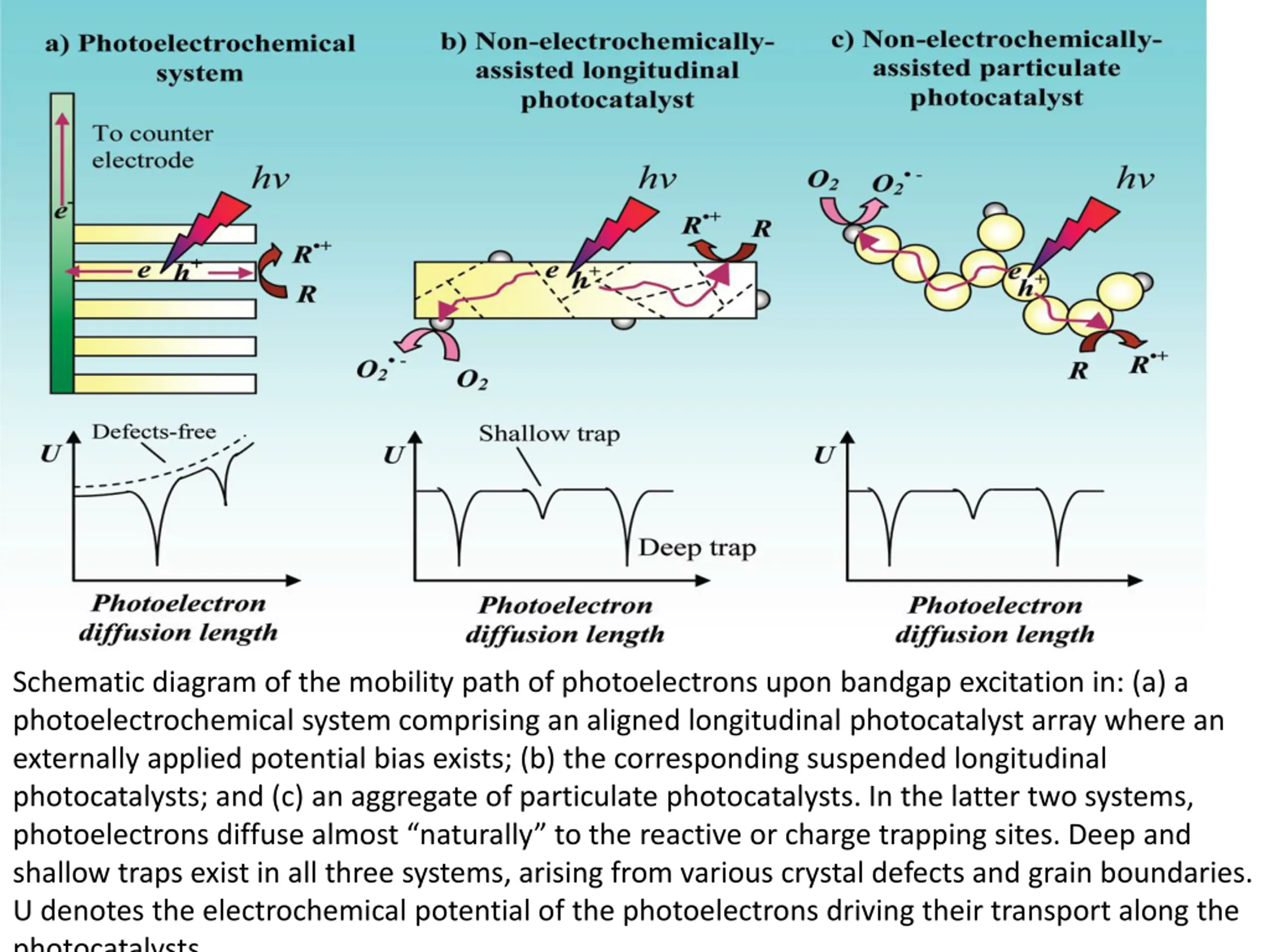 Schematic diagram of the mobility path of photoelectrons upon bandgap excitation in: (a) a photoelectrochemical system comprising an aligned longitudinal photocatalyst array where an externally applied potential bias exists; (b) the corresponding suspended longitudinal photocatalysts; and (c) an aggregate of particulate photocatalysts. In the latter two systems, photoelectrons diffuse almost naturally to the reactive or charge trapping sites. Deep and shallow traps exist in all three systems, arising from various crystal defects and grain boundaries. U denotes the electrochemical potential of the photoelectrons driving their transport along the photocatalysts. .