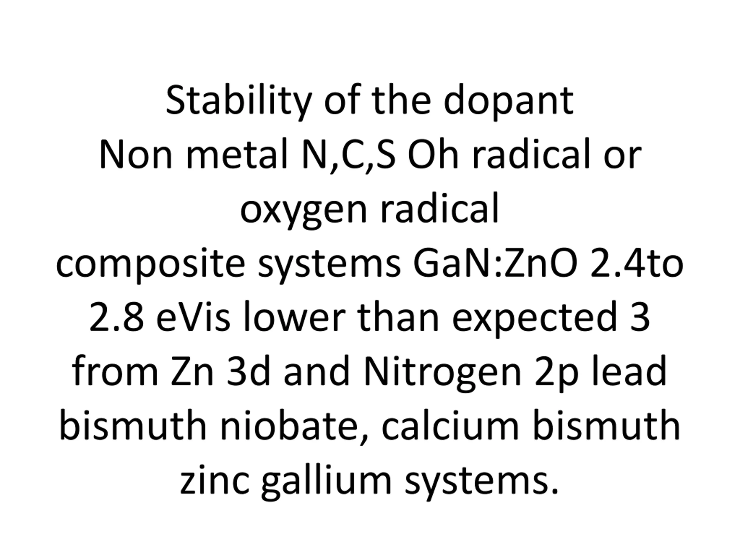 Stability of the dopant Non metal N,C,S Oh radical or oxygen radical composite systems GaN:ZnO 2.4to 2.8 eVis lower than expected 3 from Zn 3d and Nitrogen 2p lead bismuth niobate, calcium bismuth zinc gallium systems.