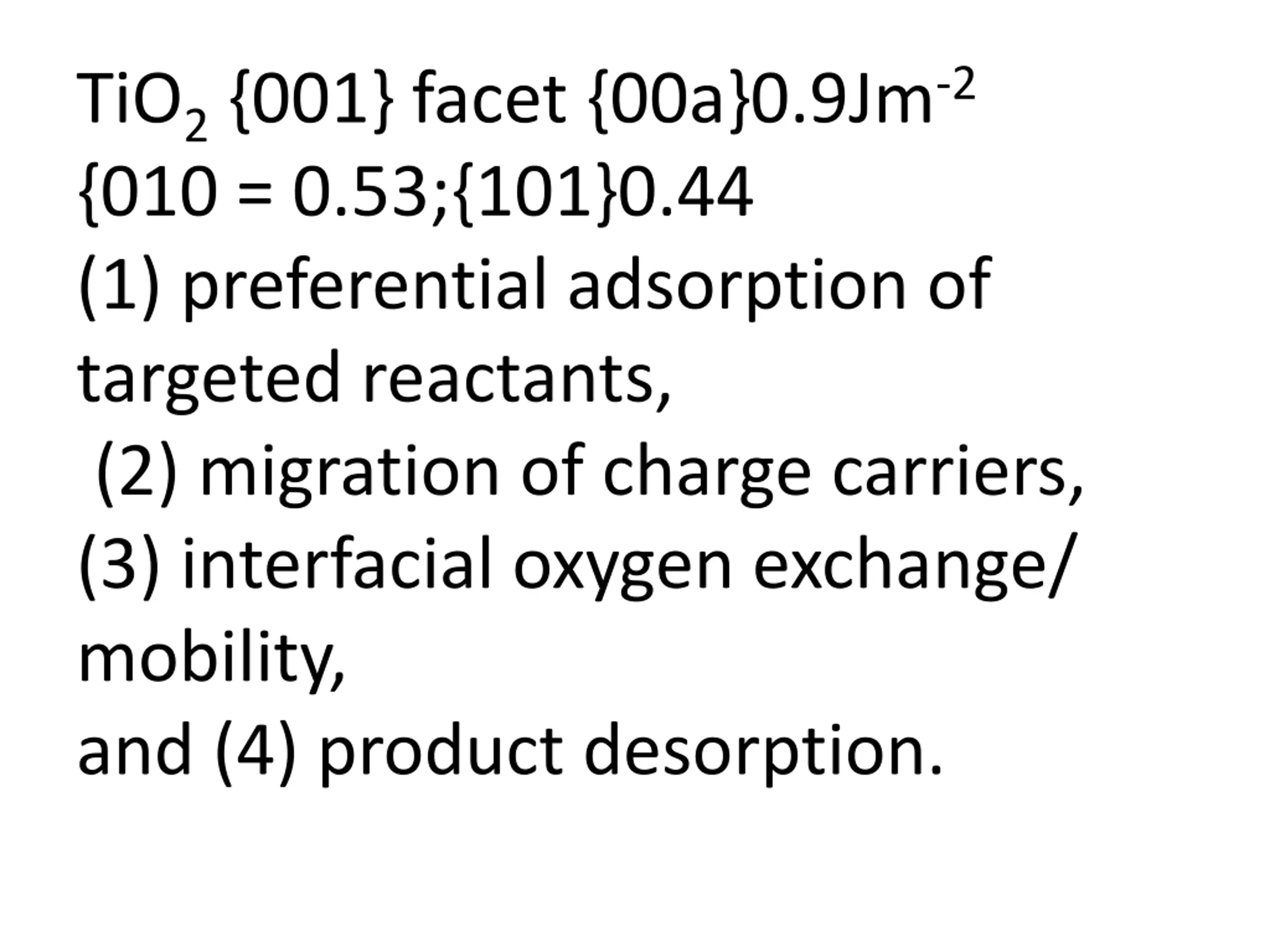TiO2 {001} facet {00a}0.9Jm-2 {010 = 0.53;{101}0.44 (1) preferential adsorption of targeted reactants, (2) migration of charge carriers, (3) interfacial oxygen exchange/ mobility, and (4) product desorption.