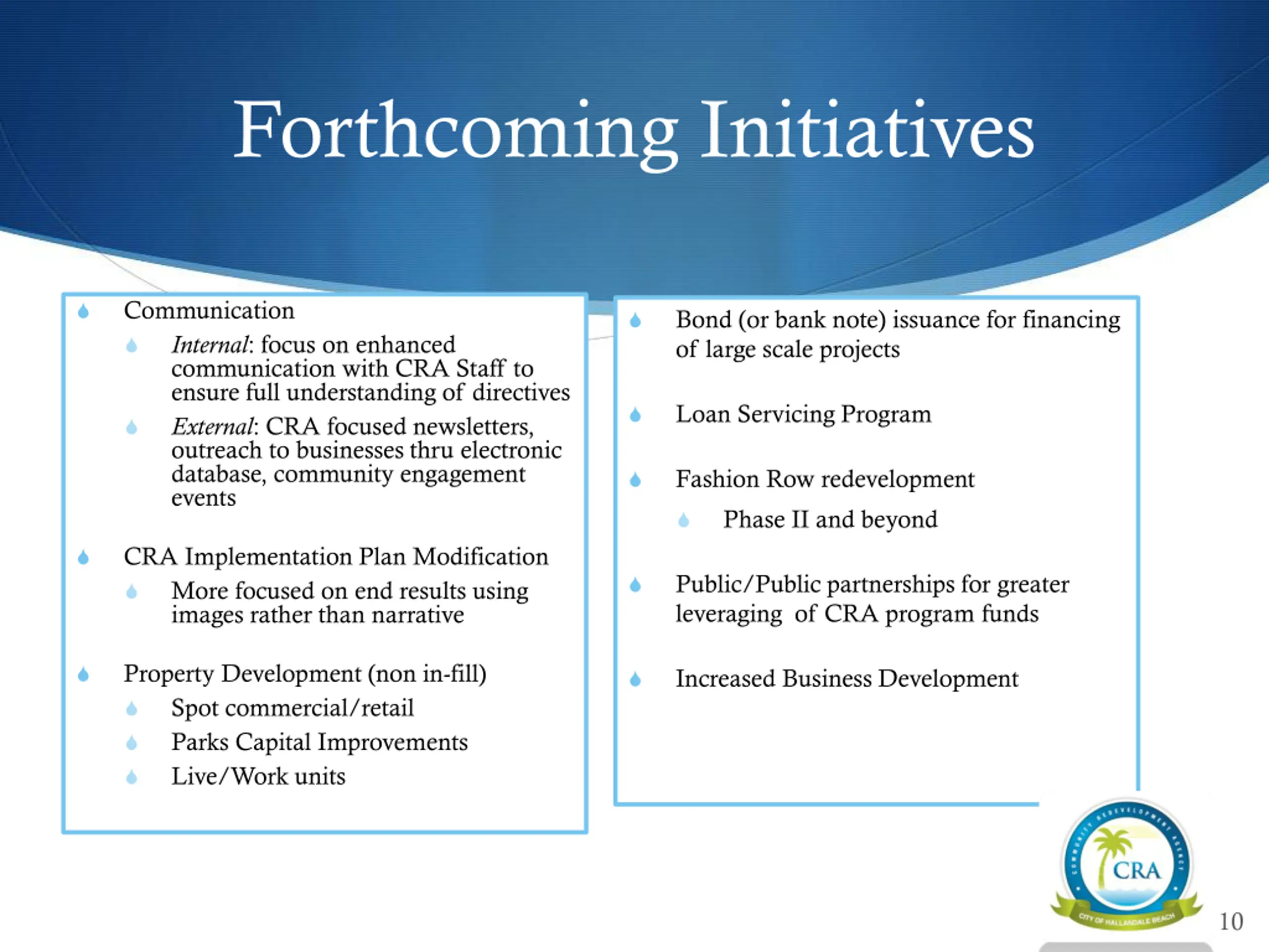 Forthcoming Initiatives Communication Internal: focus on enhanced communication with CRA Staff to ensure full understanding of directives External: CRA focused newsletters, outreach to businesses thru electronic database, community engagement events Bond (or bank note) issuance for financing of large scale projects Loan Servicing Program Fashion Row redevelopment Phase II and beyond CRA Implementation Plan Modification More focused on end results using images rather than narrative Public/Public partnerships for greater leveraging of CRA program funds Property Development (non in-fill) Spot commercial/retail Parks Capital Improvements Live/Work units Increased Business Development 10