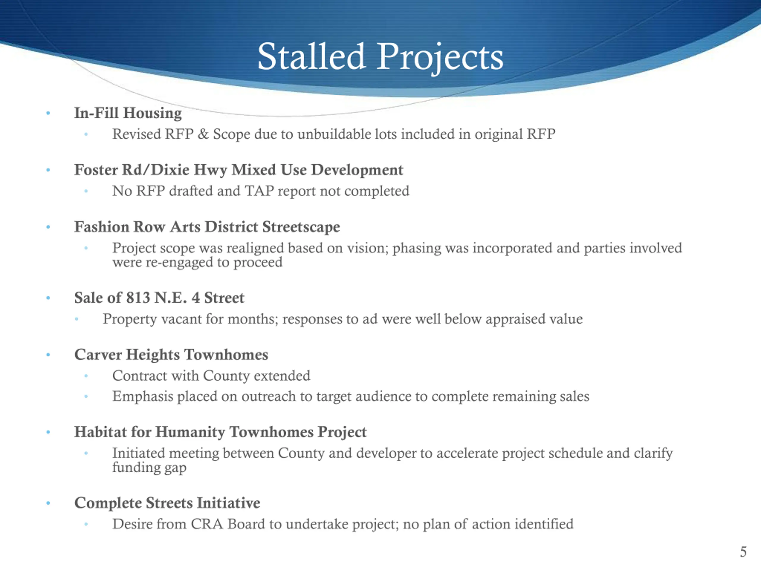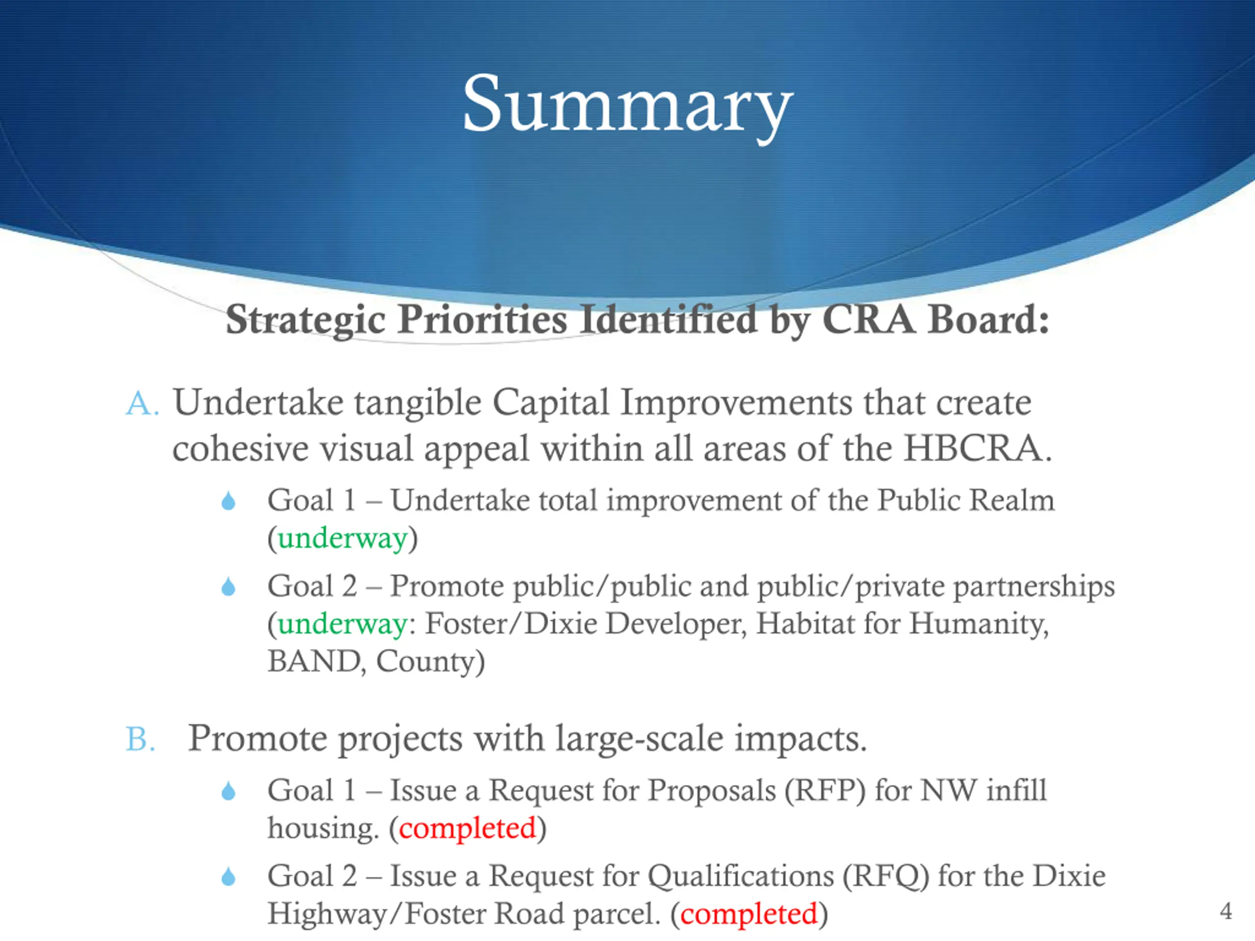 Summary Strategic Priorities Identified by CRA Board: A. Undertake tangible Capital Improvements that create cohesive visual appeal within all areas of the HBCRA. Goal 1 Undertake total improvement of the Public Realm (underway) Goal 2 Promote public/public and public/private partnerships (underway: Foster/Dixie Developer, Habitat for Humanity, BAND, County) B. Promote projects with large-scale impacts. Goal 1 Issue a Request for Proposals (RFP) for NW infill housing. (completed) Goal 2 Issue a Request for Qualifications (RFQ) for the Dixie Highway/Foster Road parcel. (completed) 4