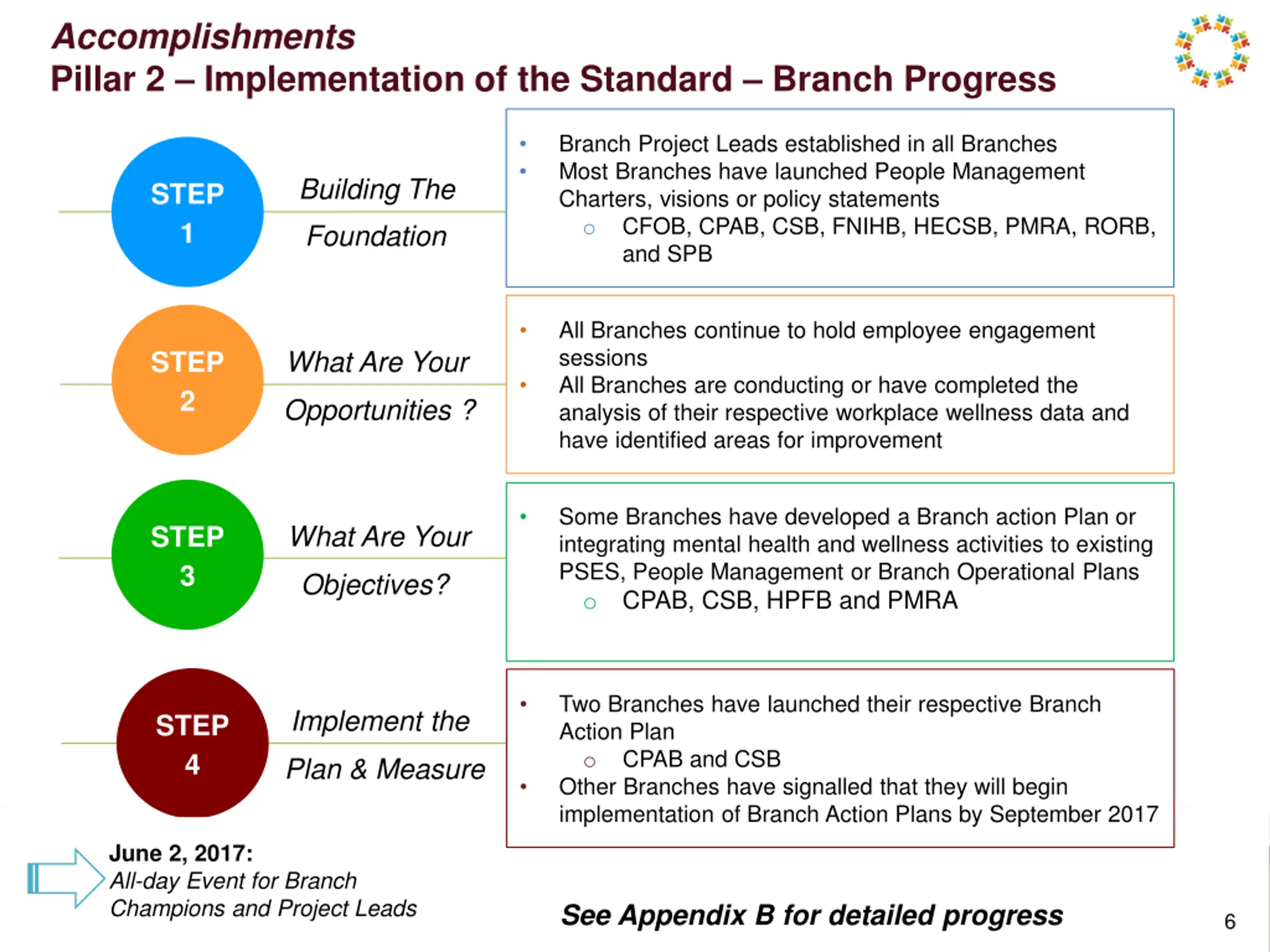 Accomplishments Pillar 2 Implementation of the Standard Branch Progress Branch Project Leads established in all Branches Most Branches have launched People Management Charters, visions or policy statements o CFOB, CPAB, CSB, FNIHB, HECSB, PMRA, RORB, and SPB Building The Foundation STEP 1 All Branches continue to hold employee engagement sessions All Branches are conducting or have completed the analysis of their respective workplace wellness data and have identified areas for improvement What Are Your STEP 2 Opportunities ? Some Branches have developed a Branch action Plan or integrating mental health and wellness activities to existing PSES, People Management or Branch Operational Plans o CPAB, CSB, HPFB and PMRA What Are Your STEP 3 Objectives? Two Branches have launched their respective Branch Action Plan o CPAB and CSB Other Branches have signalled that they will begin implementation of Branch Action Plans by September 2017 Implement the STEP 4 Plan & Measure June 2, 2017: All-day Event for Branch Champions and Project Leads See Appendix B for detailed progress 6