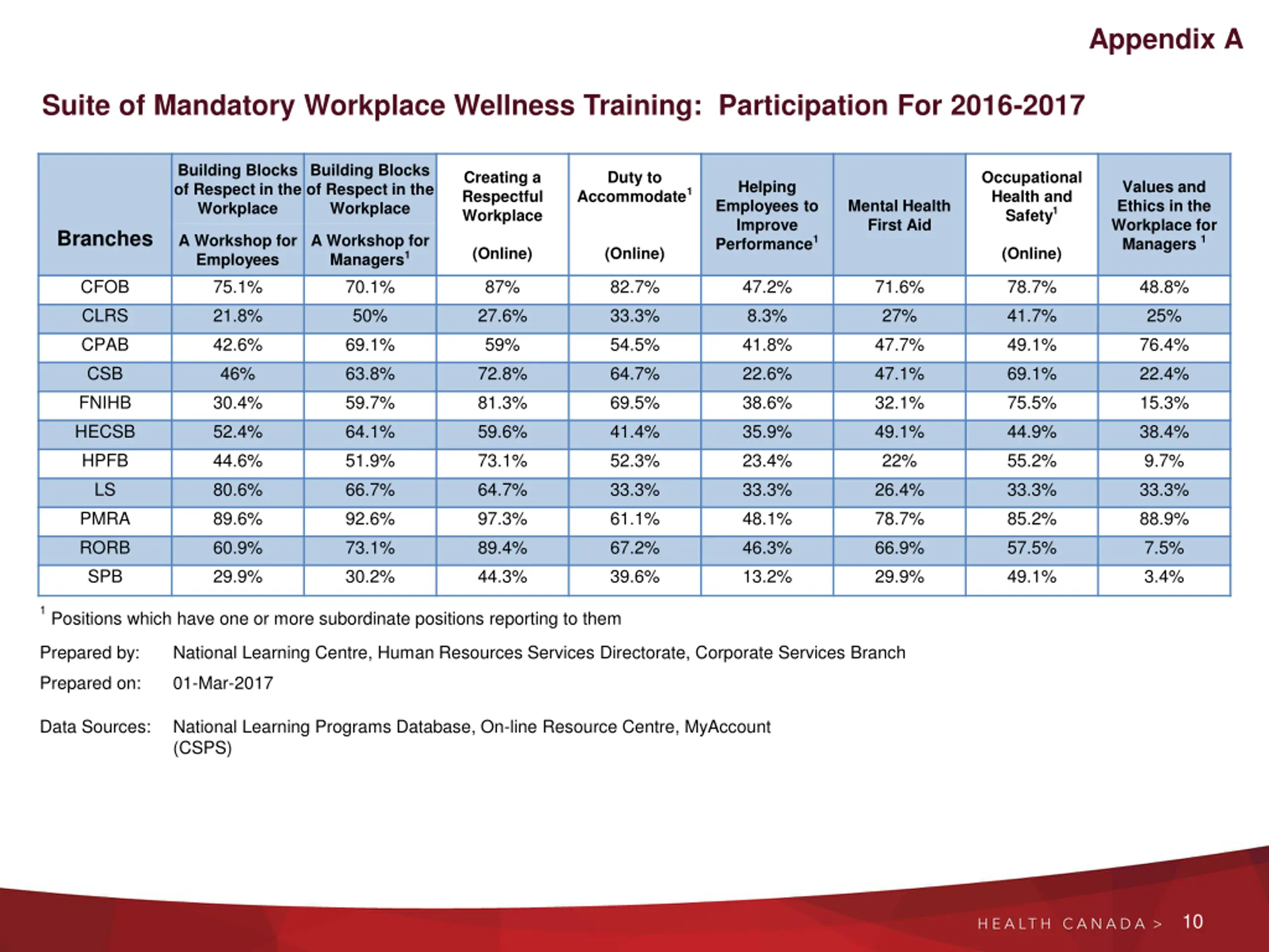 Accomplishments Pillar 1 Promotion of Resources and Building Skills 3. Mandatory Workplace Wellness Training Highlights Building Blocks of Respect Branch-specific offerings resulted in significant increased in participation between November 2016 and February 2017. o Building Blocks of Respect for Managers from 44% to 52% o Building Blocks of Respect for Employees from 20% and 29% Mental Health First Aid (MHFA) Excellent take up on MHFA training, nationally. o 126 sessions offered, and approximately 2,240 HC employees have participated in 2016-2017. o To date, more than 4,300 HC employees successfully completed MHFA. Online Training In most Branches: more than 50% of Managershave taken Duty to Accommodate, and over 45% have completed Occupational Health and Safety; and over 60% of employees at all levels have participated in the Creating Respectful Workplaces. Appendix A outlines the participation by Branch in classroom and online mandatory training. We will continue to: o Deliver Branch-specific mandatory workplace wellness training. o Work with Branches to deliver training offerings to employees in remote and isolated locations. o Leverage key events (i.e. Mental Illness Awareness Week, Bell Let s Talk, town hall meetings) to continuously engage employees and provide them with tools and resources to build capacity to proactively address workplace wellness issues. 5