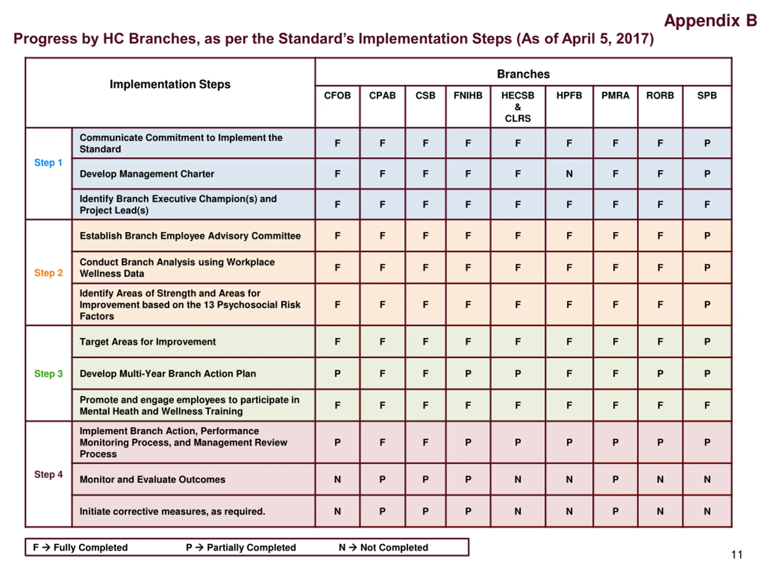 Appendix B Progress by HC Branches, as per the Standard s Implementation Steps (As of April 5, 2017) Branches Implementation Steps CFOB CPAB CSB FNIHB HECSB & CLRS HPFB PMRA RORB SPB Communicate Commitment to Implement the Standard F F F F F F F F P Step 1 Develop Management Charter F F F F F N F F P Identify Branch Executive Champion(s) and Project Lead(s) F F F F F F F F F Establish Branch Employee Advisory Committee F F F F F F F F P Conduct Branch Analysis using Workplace Wellness Data F F F F F F F F P Step 2 Identify Areas of Strength and Areas for Improvement based on the 13 Psychosocial Risk Factors F F F F F F F F P Target Areas for Improvement F F F F F F F F P Step 3 Develop Multi-Year Branch Action Plan P F F P P F F P P Promote and engage employees to participate in Mental Heath and Wellness Training F F F F F F F F F Implement Branch Action, Performance Monitoring Process, and Management Review Process P F F P P P P P P Step 4 Monitor and Evaluate Outcomes N P P P N N P N N Initiate corrective measures, as required. N P P P N N P N N F Fully Completed P Partially Completed N Not Completed 11