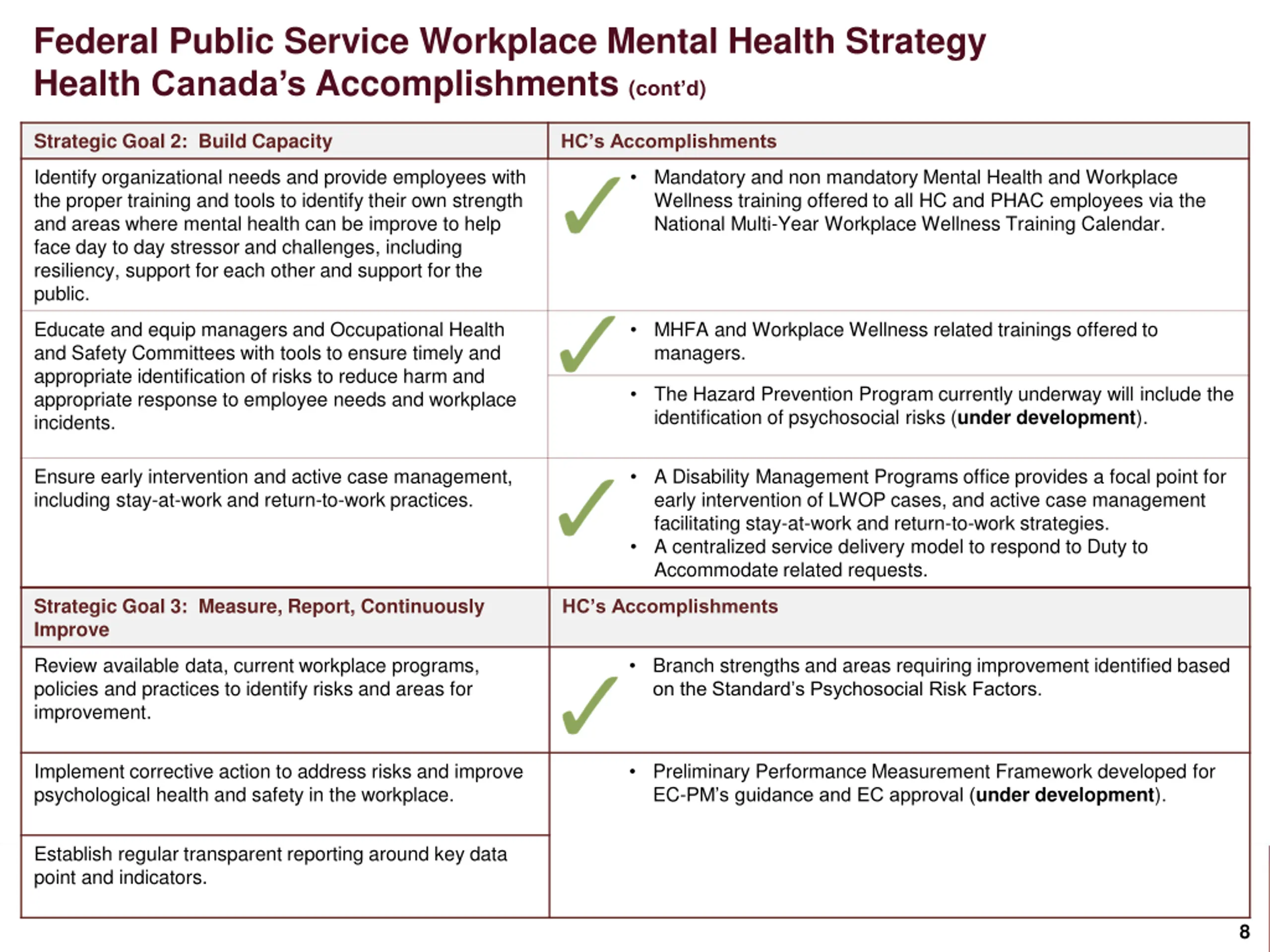 Federal Public Service Workplace Mental Health Strategy Health Canada s Accomplishments Strategic Goal 1: Change the Culture HC s Accomplishments Appoint a psychological health and safety champion. Departmental Workplace Well-being Champion identified. A community of Branch Champions established throughout the Department promoting Workplace Wellness and the implementation of the National Standard for Psychological Health and Safety in the Workplace (the Standard). Raise awareness of mental health issues in the workplace and of available workplace health support services. Senior management messages identify and promote the use of available resources. Health Talks with the Minister, Mental Health Awareness Week, Bell Let s Talk and Mental Health Week Dedicated intranet site for Mental Health and Wellness tools and resources. Best practices resources distributed at key departmental and federal public service-wide events (Workplace Wellness Resource One Pager, the Workplace Wellness Kit, Not Myself Today Campaign). Engage employees and Occupational Health and Safety (OHS) Committees and promote employee participation and psychological health and safety action and measures. Mental Health and Workplace Wellness is a standing item at the National and HR Union Management Consultation Committees, as well as, the quarterly Departmental Occupational Health and Safety Policy Committee. Specific Mental Health Fist Aid (MHFA) sessions offered to OHS Committee Members and Representatives. On going employee engagement sessions, and establishment of Branch employee advisory committee. 7