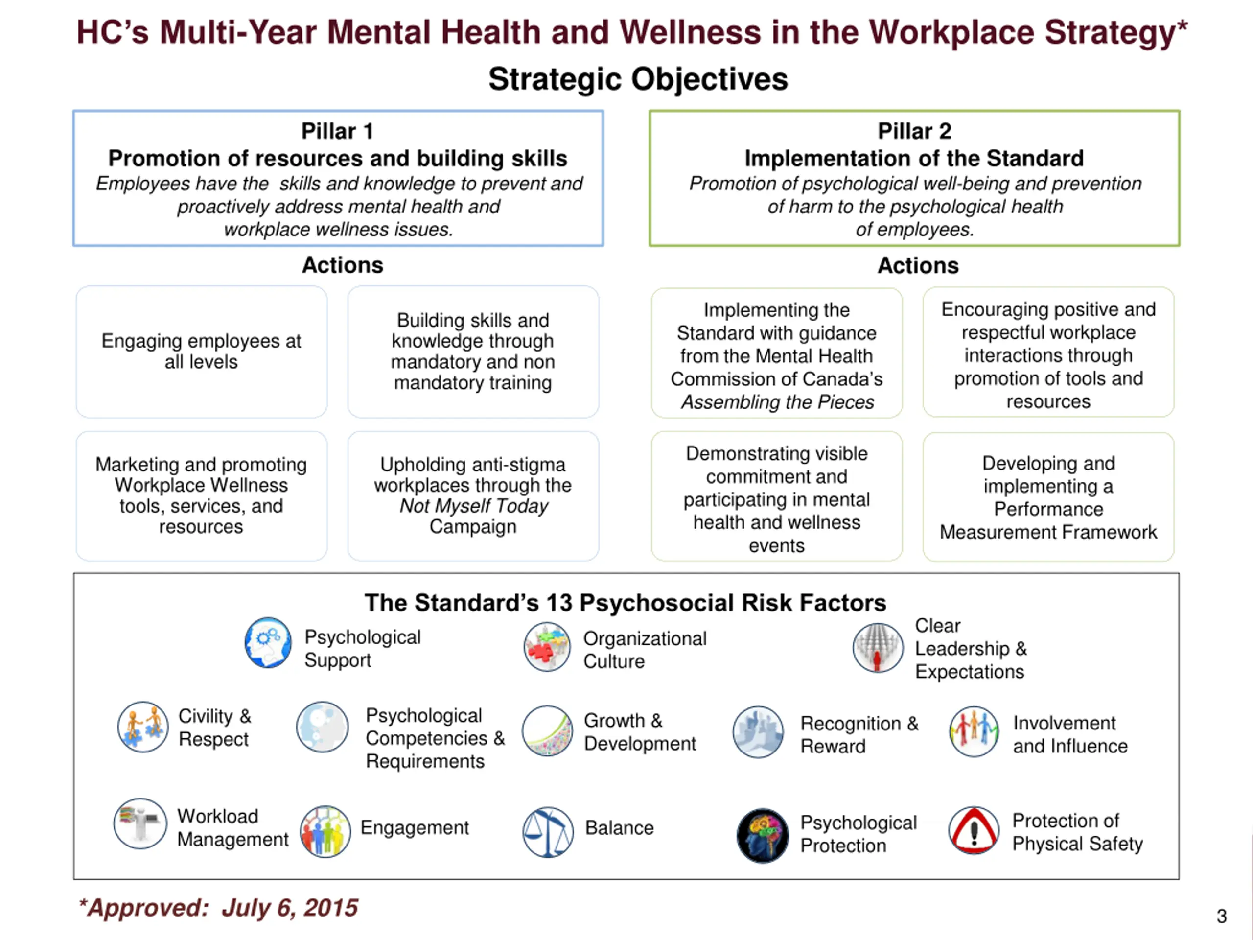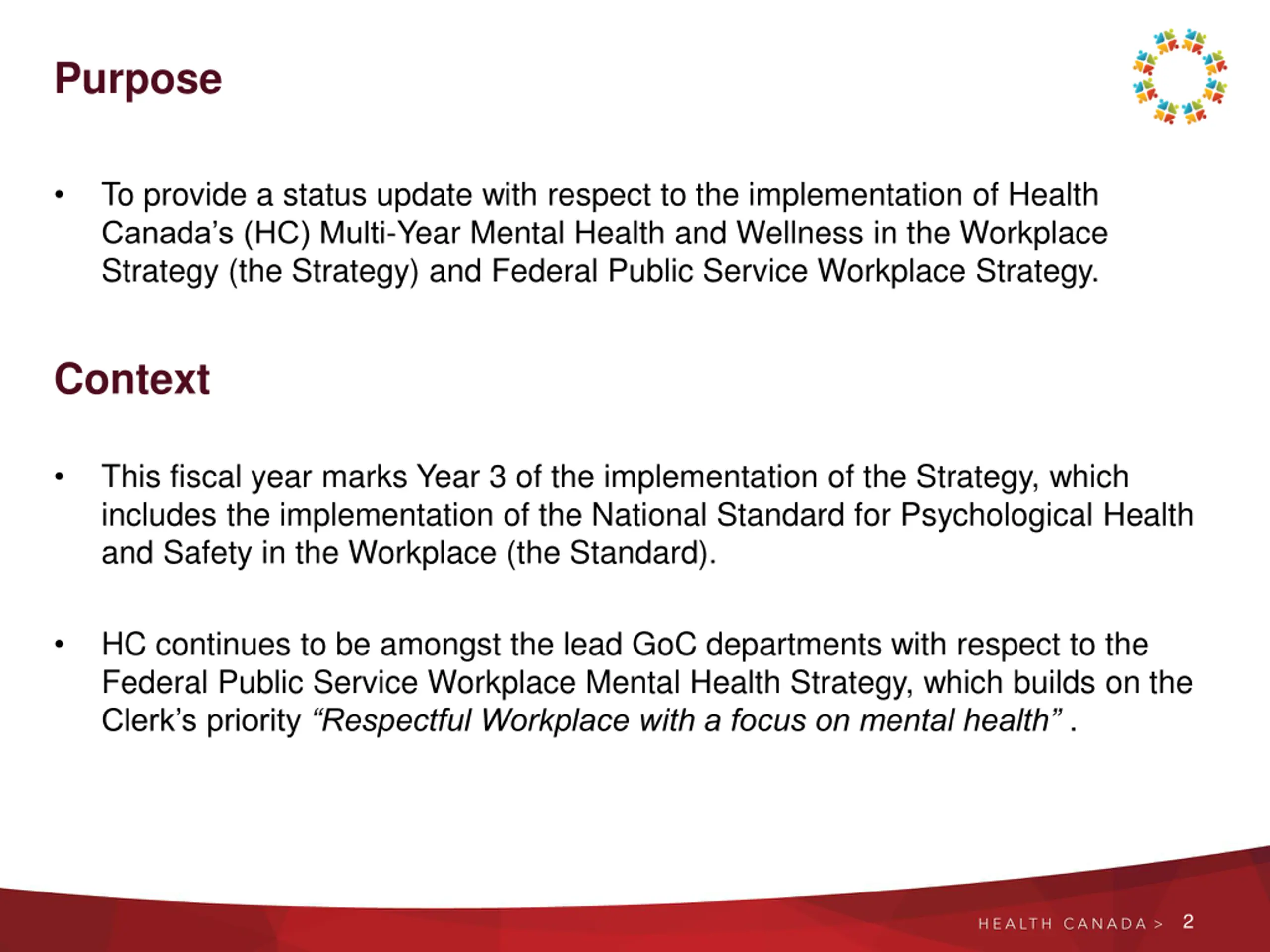 Purpose To provide a status update with respect to the implementation of Health Canada s (HC) Multi-Year Mental Health and Wellness in the Workplace Strategy (the Strategy) and Federal Public Service Workplace Strategy. Context This fiscal year marks Year 3 of the implementation of the Strategy, which includes the implementation of the National Standard for Psychological Health and Safety in the Workplace (the Standard). HC continues to be amongst the lead GoC departments with respect to the Federal Public Service Workplace Mental Health Strategy, which builds on the Clerk s priority Respectful Workplace with a focus on mental health . 2