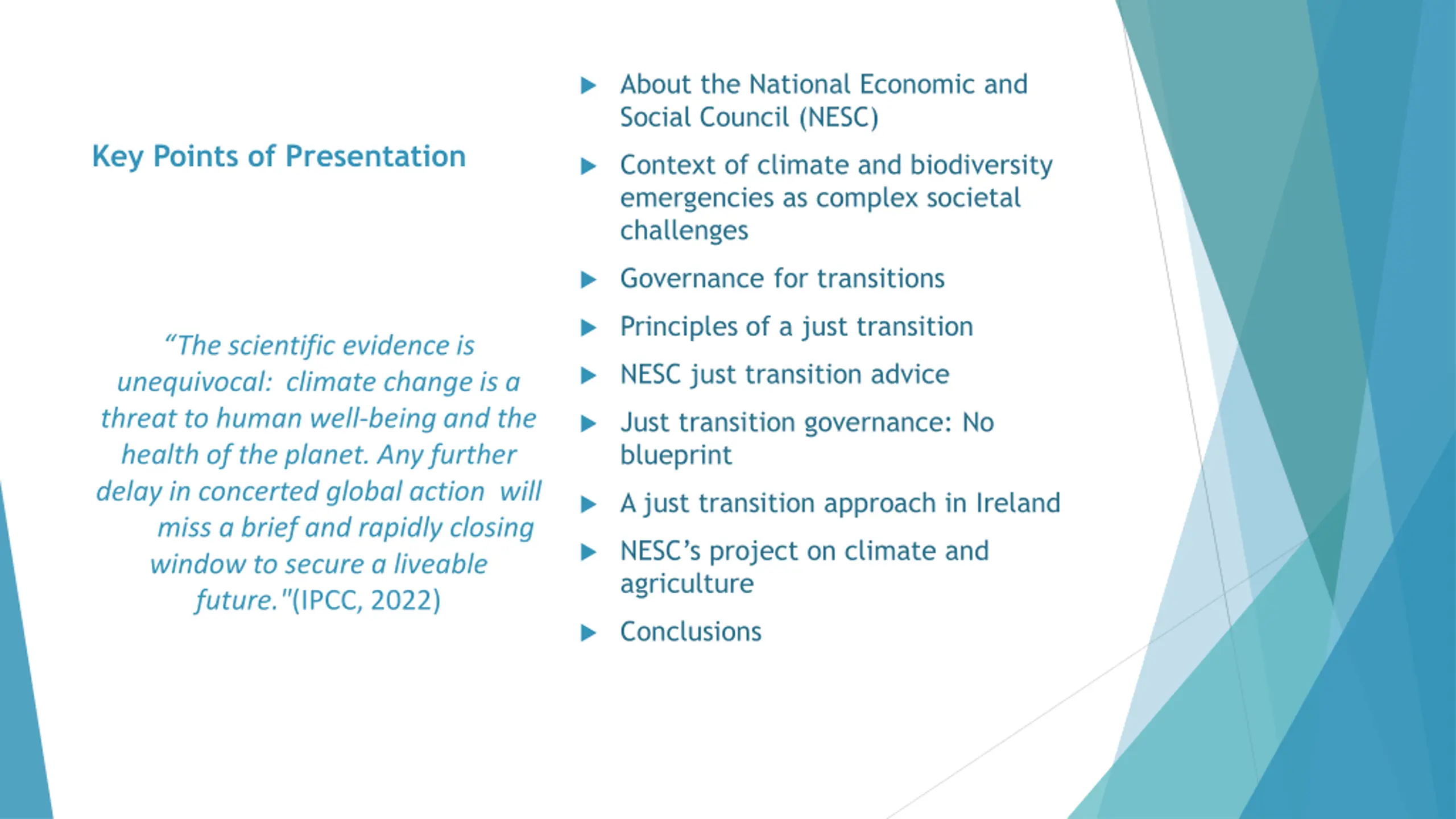 About the National Economic and Social Council (NESC) Key Points of Presentation Context of climate and biodiversity emergencies as complex societal challenges Governance for transitions Principles of a just transition The scientific evidence is unequivocal: climate change is a threat to human well-being and the health of the planet. Any further delay in concerted global action will miss a brief and rapidly closing window to secure a liveable future."(IPCC, 2022) NESC just transition advice Just transition governance: No blueprint A just transition approach in Ireland NESC s project on climate and agriculture Conclusions