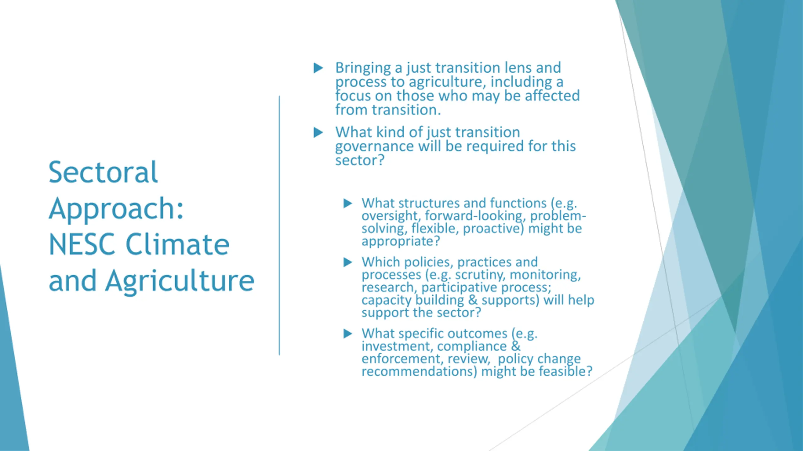 Bringing a just transition lens and process to agriculture, including a focus on those who may be affected from transition. What kind of just transition governance will be required for this sector? Sectoral Approach: NESC Climate and Agriculture What structures and functions (e.g. oversight, forward-looking, problem- solving, flexible, proactive) might be appropriate? Which policies, practices and processes (e.g. scrutiny, monitoring, research, participative process; capacity building & supports) will help support the sector? What specific outcomes (e.g. investment, compliance & enforcement, review, policy change recommendations) might be feasible?