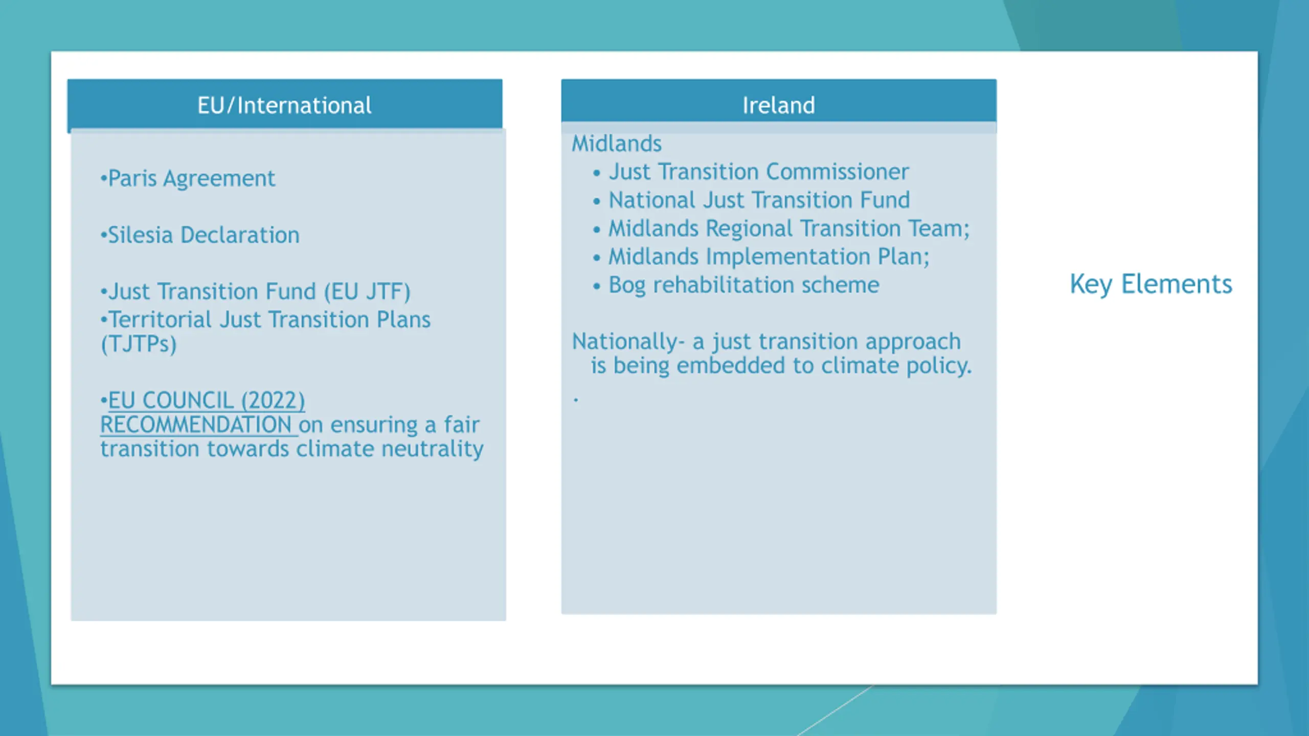 EU/International Ireland Midlands Just Transition Commissioner National Just Transition Fund Midlands Regional Transition Team; Midlands Implementation Plan; Bog rehabilitation scheme EU COUNCIL (2022) RECOMMENDATION EU COUNCIL (2022) RECOMMENDATION Paris Agreement EU COUNCIL (2022) RECOMMENDATION EU COUNCIL (2022) RECOMMENDATION Silesia Declaration Key Elements Just Transition Fund (EU JTF) Territorial Just Transition Plans (TJTPs) Nationally- a just transition approach is being embedded to climate policy. . EU COUNCIL (2022) RECOMMENDATION on ensuring a fair transition towards climate neutrality