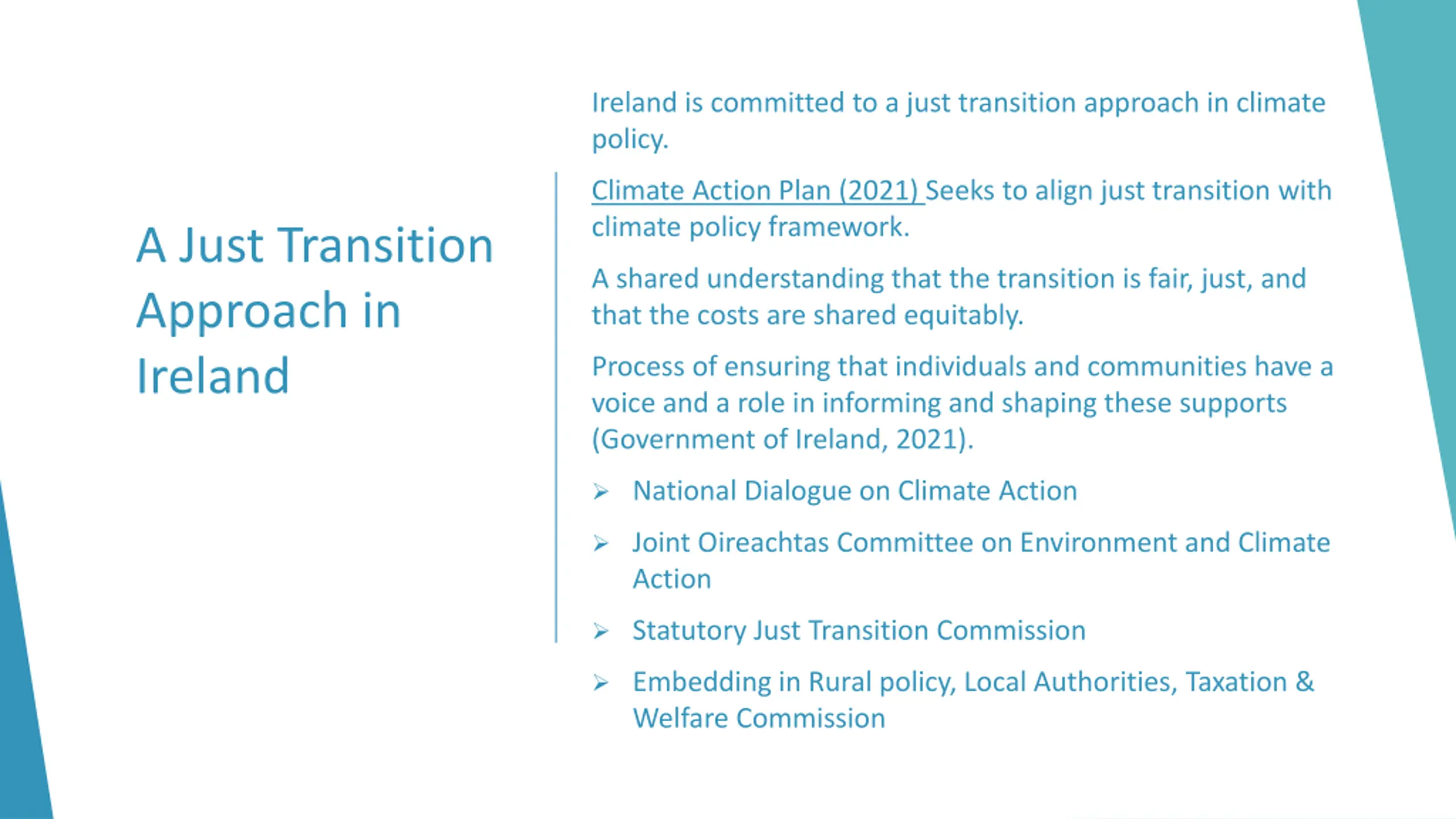 Ireland is committed to a just transition approach in climate policy. Climate Action Plan (2021) Seeks to align just transition with climate policy framework. A Just Transition Approach in Ireland A shared understanding that the transition is fair, just, and that the costs are shared equitably. Process of ensuring that individuals and communities have a voice and a role in informing and shaping these supports (Government of Ireland, 2021). National Dialogue on Climate Action Joint Oireachtas Committee on Environment and Climate Action Statutory Just Transition Commission Embedding in Rural policy, Local Authorities, Taxation & Welfare Commission