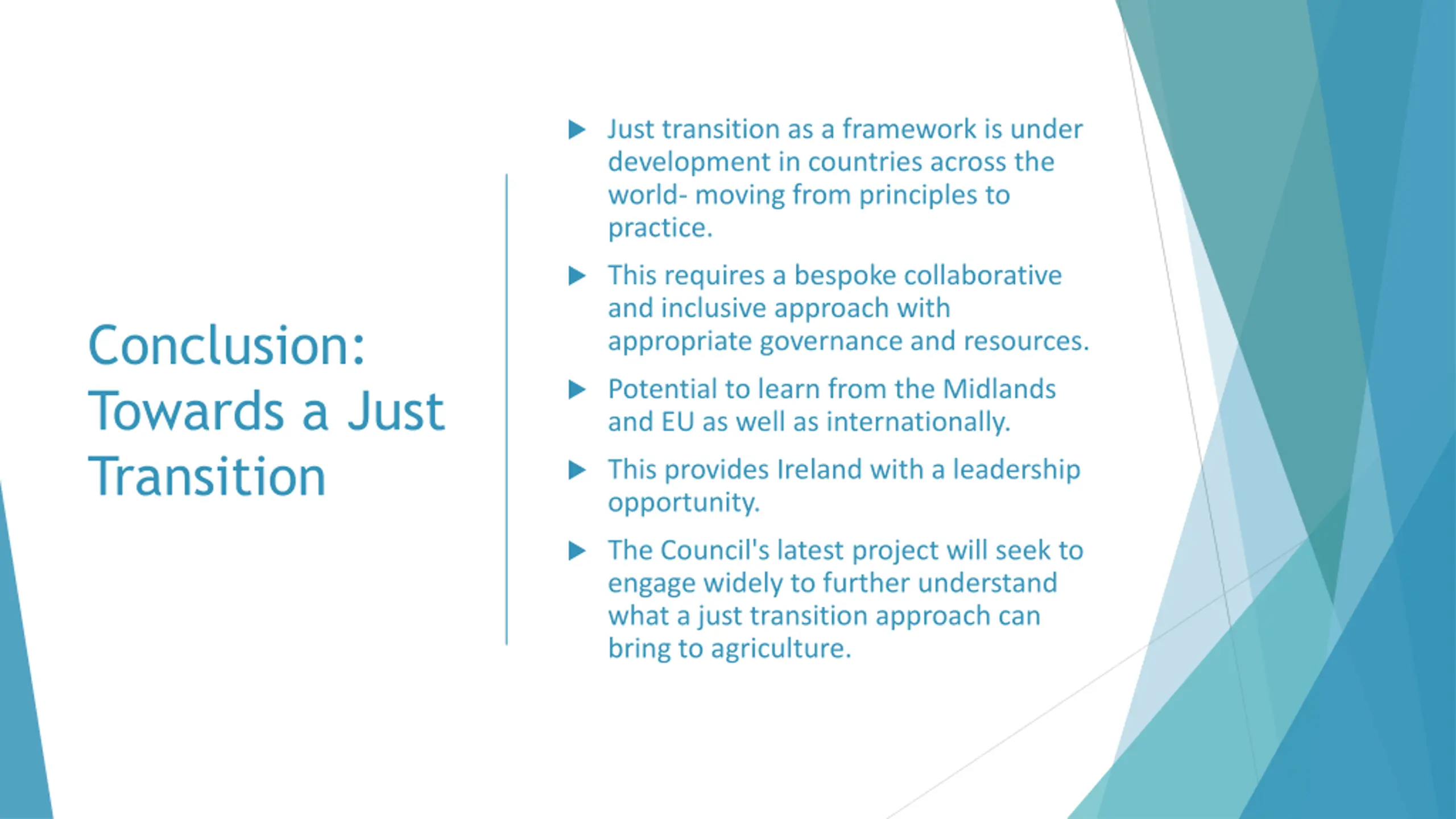 Just transition as a framework is under development in countries across the world- moving from principles to practice. This requires a bespoke collaborative and inclusive approach with appropriate governance and resources. Conclusion: Towards a Just Transition Potential to learn from the Midlands and EU as well as internationally. This provides Ireland with a leadership opportunity. The Council's latest project will seek to engage widely to further understand what a just transition approach can bring to agriculture.
