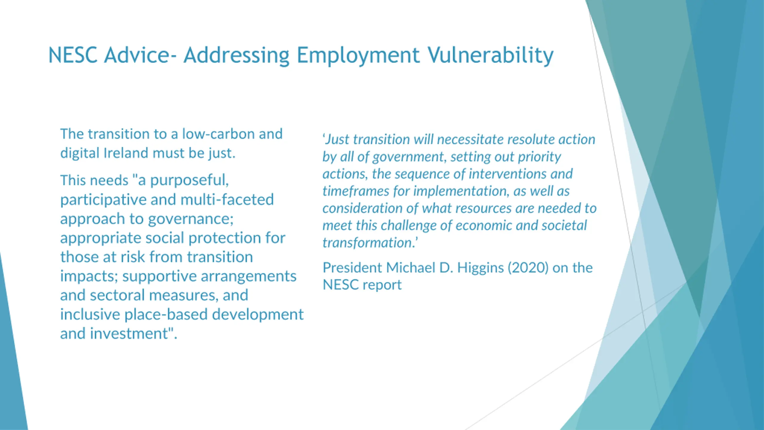 NESC Advice- Addressing Employment Vulnerability The transition to a low-carbon and digital Ireland must be just. This needs "a purposeful, participative and multi-faceted approach to governance; appropriate social protection for those at risk from transition impacts; supportive arrangements and sectoral measures, and inclusive place-based development and investment". Just transition will necessitate resolute action by all of government, setting out priority actions, the sequence of interventions and timeframes for implementation, as well as consideration of what resources are needed to meet this challenge of economic and societal transformation. President Michael D. Higgins (2020) on the NESC report