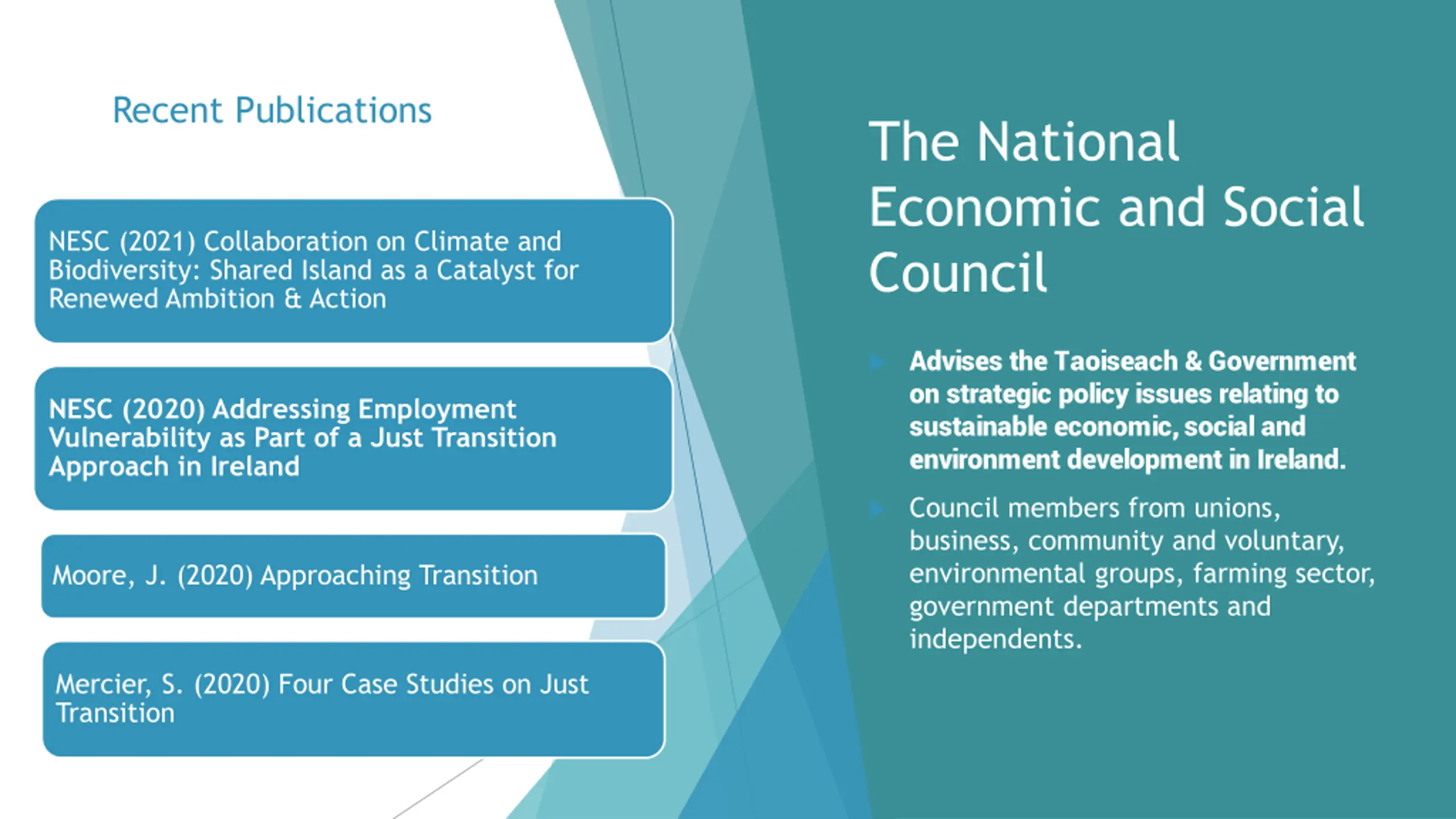 Recent Publications The National Economic and Social Council NESC (2021) Collaboration on Climate and Biodiversity: Shared Island as a Catalyst for Renewed Ambition & Action Advises the Taoiseach & Government on strategic policy issues relating to sustainable economic, social and environment development in Ireland. NESC (2020) Addressing Employment Vulnerability as Part of a Just Transition Approach in Ireland Council members from unions, business, community and voluntary, environmental groups, farming sector, government departments and independents. Moore, J. (2020) Approaching Transition Mercier, S. (2020) Four Case Studies on Just Transition