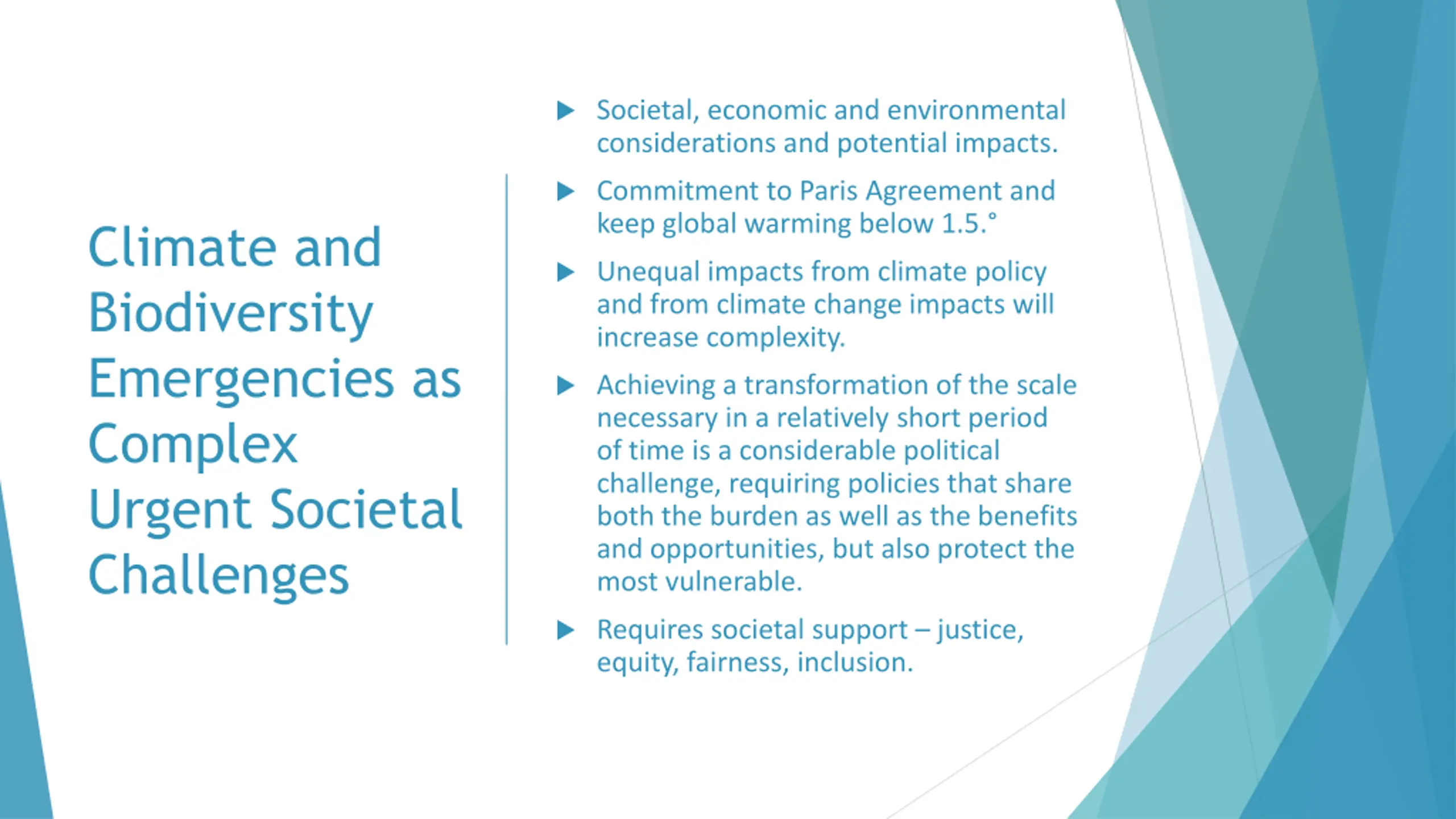 Societal, economic and environmental considerations and potential impacts. Commitment to Paris Agreement and keep global warming below 1.5. Climate and Biodiversity Emergencies as Complex Urgent Societal Challenges Unequal impacts from climate policy and from climate change impacts will increase complexity. Achieving a transformation of the scale necessary in a relatively short period of time is a considerable political challenge, requiring policies that share both the burden as well as the benefits and opportunities, but also protect the most vulnerable. Requires societal support justice, equity, fairness, inclusion.
