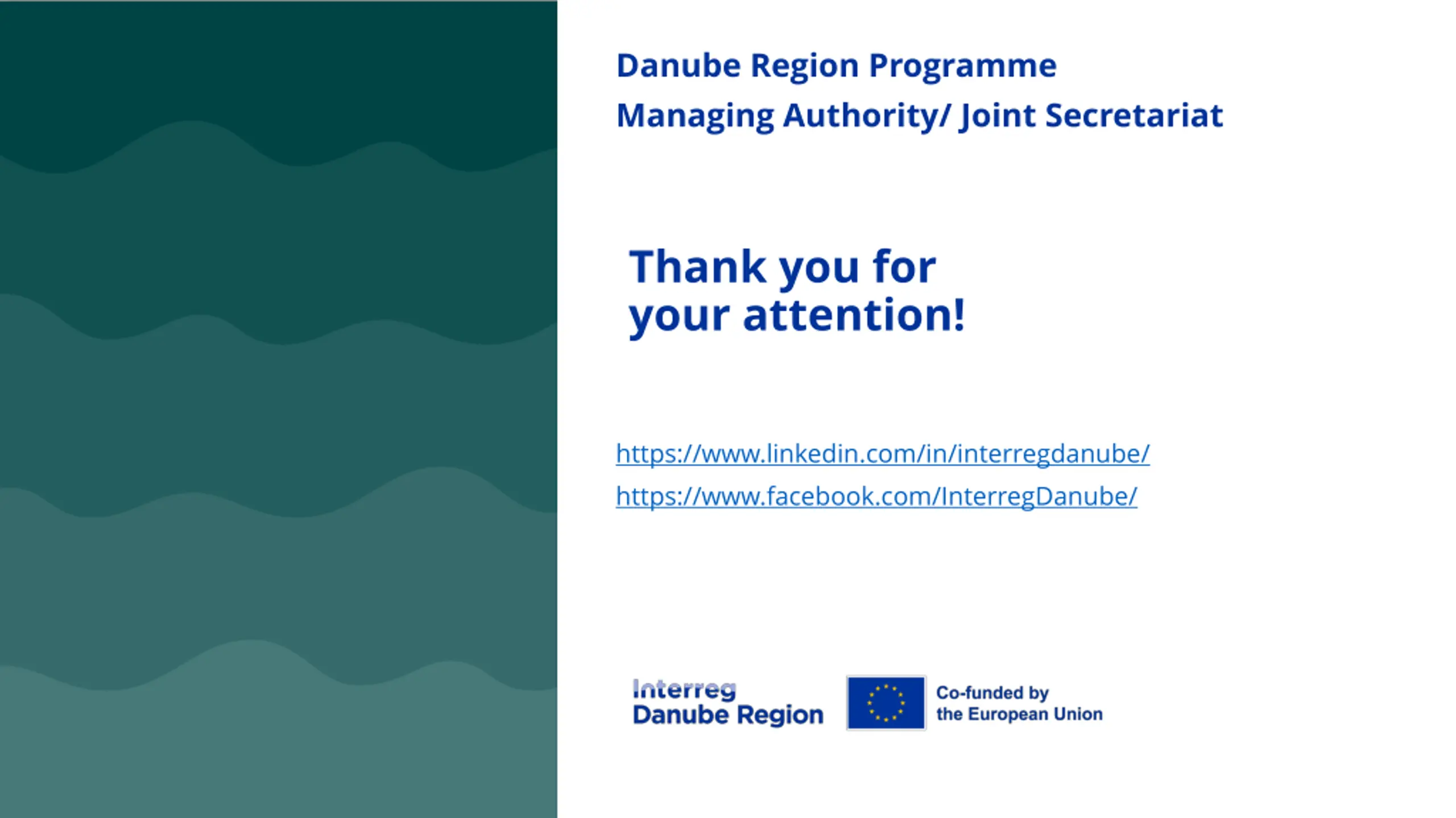 Danube Region Programme Managing Authority/ Joint Secretariat Thank you for your attention! https://www.linkedin.com/in/interregdanube/ https://www.facebook.com/InterregDanube/