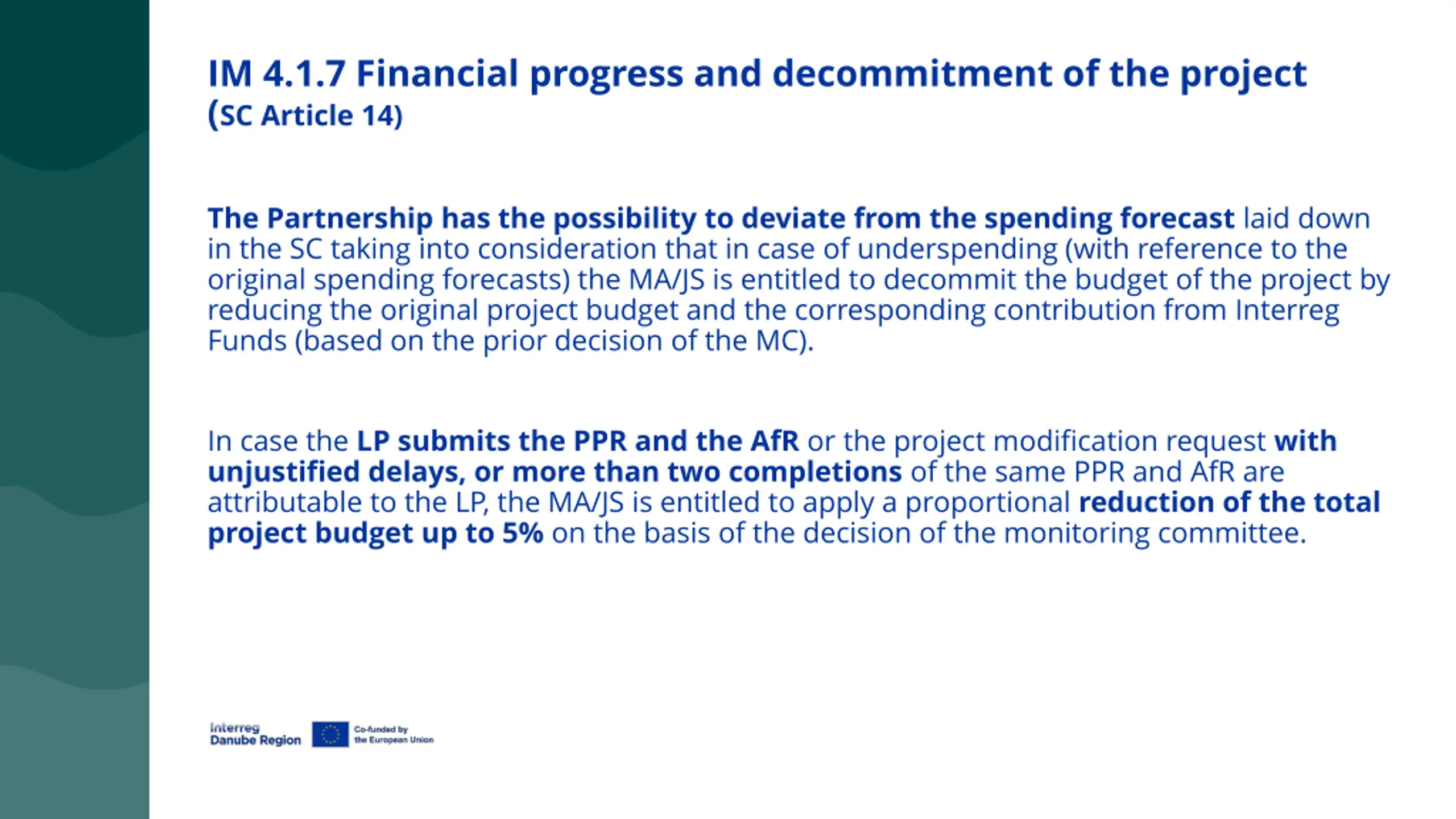 IM 4.1.7 Financial progress and decommitment of the project (SC Article 14) The Partnership has the possibility to deviate from the spending forecast laid down in the SC taking into consideration that in case of underspending (with reference to the original spending forecasts) the MA/JS is entitled to decommit the budget of the project by reducing the original project budget and the corresponding contribution from Interreg Funds (based on the prior decision of the MC). In case the LP submits the PPR and the AfR or the project modification request with unjustified delays, or more than two completions of the same PPR and AfR are attributable to the LP, the MA/JS is entitled to apply a proportional reduction of the total project budget up to 5% on the basis of the decision of the monitoring committee.