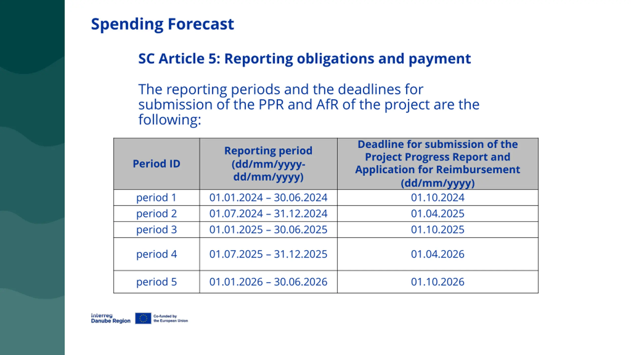 Spending Forecast SC Article 5: Reporting obligations and payment The reporting periods and the deadlines for submission of the PPR and AfR of the project are the following: Deadline for submission of the Project Progress Report and Application for Reimbursement (dd/mm/yyyy) 01.10.2024 01.04.2025 01.10.2025 Reporting period (dd/mm/yyyy- dd/mm/yyyy) Period ID period 1 period 2 period 3 01.01.2024 30.06.2024 01.07.2024 31.12.2024 01.01.2025 30.06.2025 period 4 01.07.2025 31.12.2025 01.04.2026 period 5 01.01.2026 30.06.2026 01.10.2026