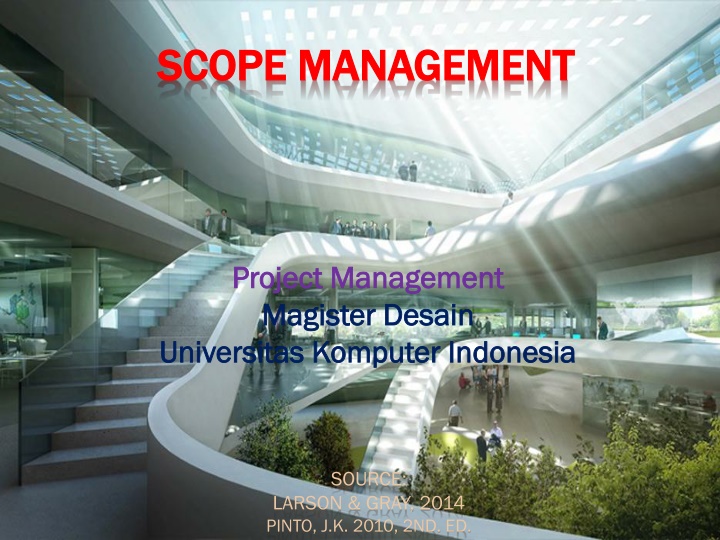 SCOPE MANAGEMENT SCOPE MANAGEMENT Project Management Project Management Magister Magister Desain Universitas Komputer Indonesia Universitas Komputer Indonesia Desain SOURCE: LARSON & GRAY, 2014 PINTO, J.K. 2010, 2ND. ED.