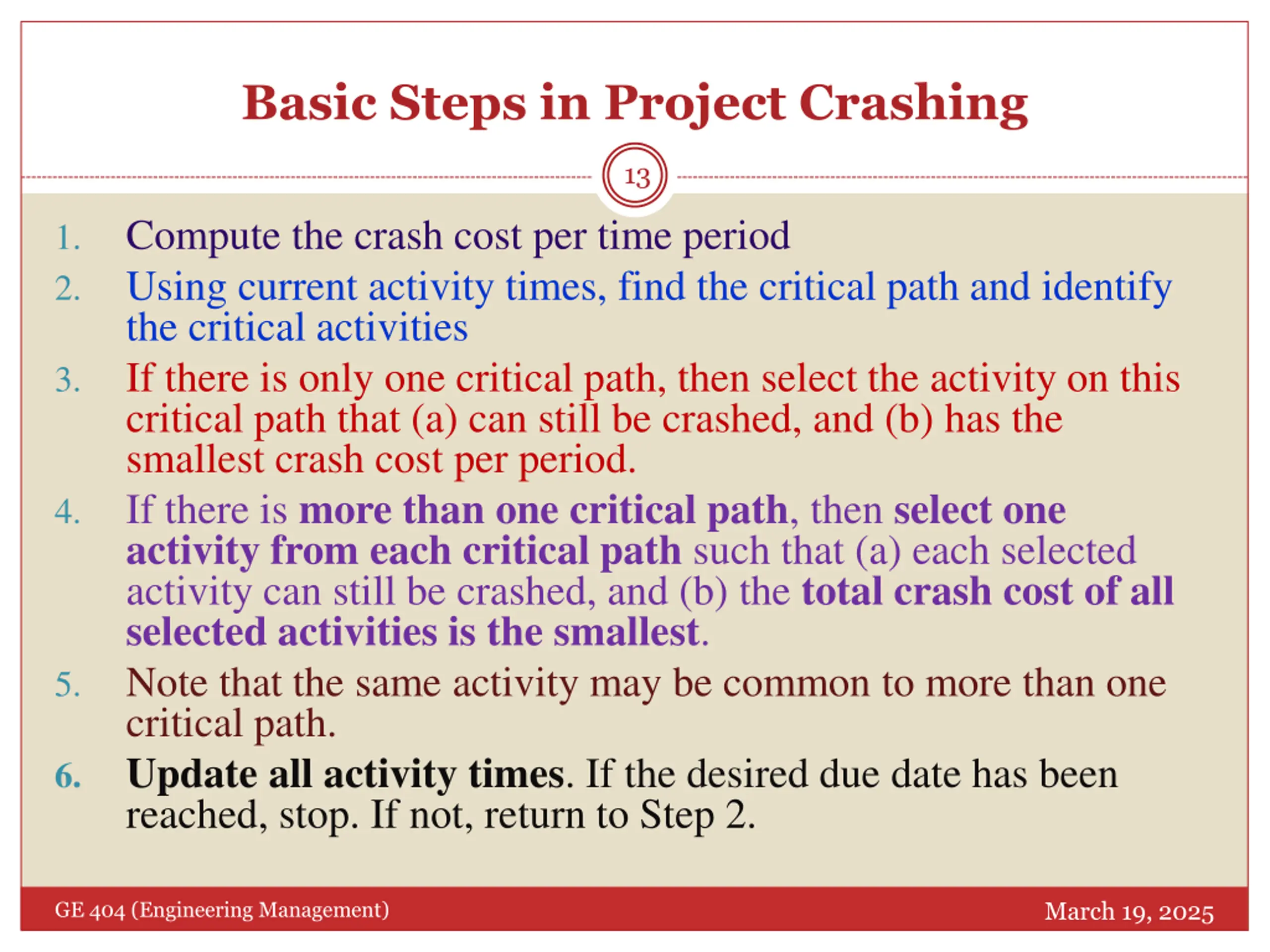 Note 25 For large network, use criticality theorem to eliminate the noncritical paths that do not need to be crashed. Eliminate Activities with having TF > the required project reduction time. March 19, 2025 GE 404 (Engineering Management)