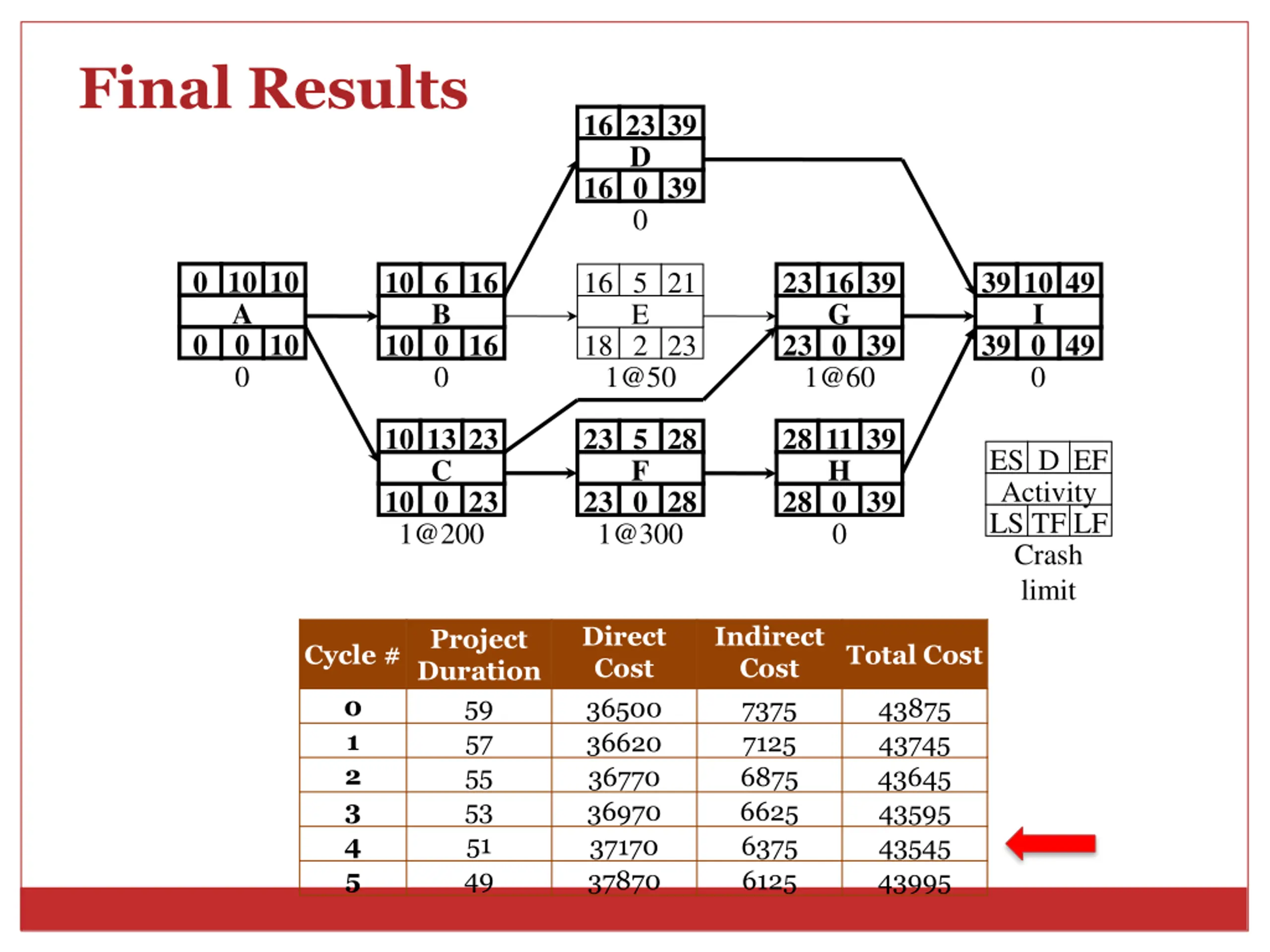 Final Results 16 23 39 D 16 0 39 0 0 10 10 A 10 6 16 B 23 16 39 G 39 10 49 I 16 5 21 E 0 0 10 10 0 16 23 0 39 39 0 49 18 2 23 0 0 1@50 1@60 0 10 13 23 C 23 5 28 F 28 11 39 H ES D EF Activity 10 0 23 23 0 28 28 0 39 LS TF LF Crash limit 1@200 1@300 0 Direct Cost 36500 36620 36770 36970 37170 37870 Indirect Cost 7375 7125 6875 6625 6375 6125 Project Duration 59 57 55 53 51 49 Cycle # Total Cost 0 1 2 3 4 5 43875 43745 43645 43595 43545 43995