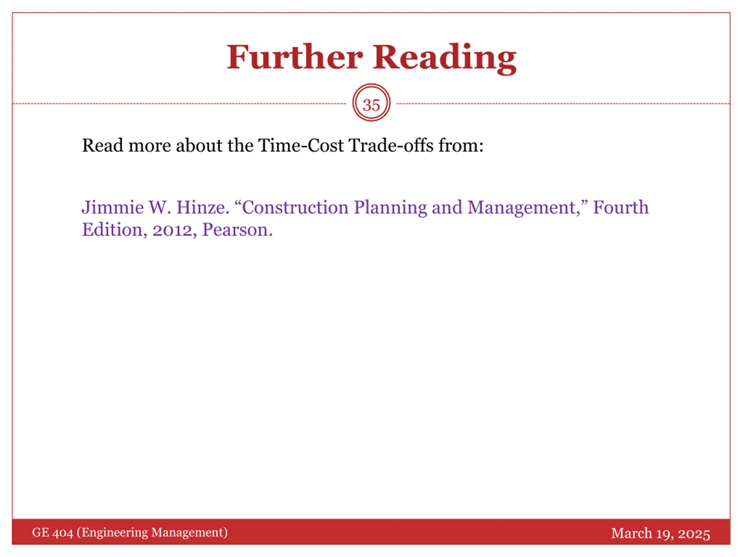 Further Reading 35 Read more about the Time-Cost Trade-offs from: Jimmie W. Hinze. Construction Planning and Management, Fourth Edition, 2012, Pearson. March 19, 2025 GE 404 (Engineering Management)