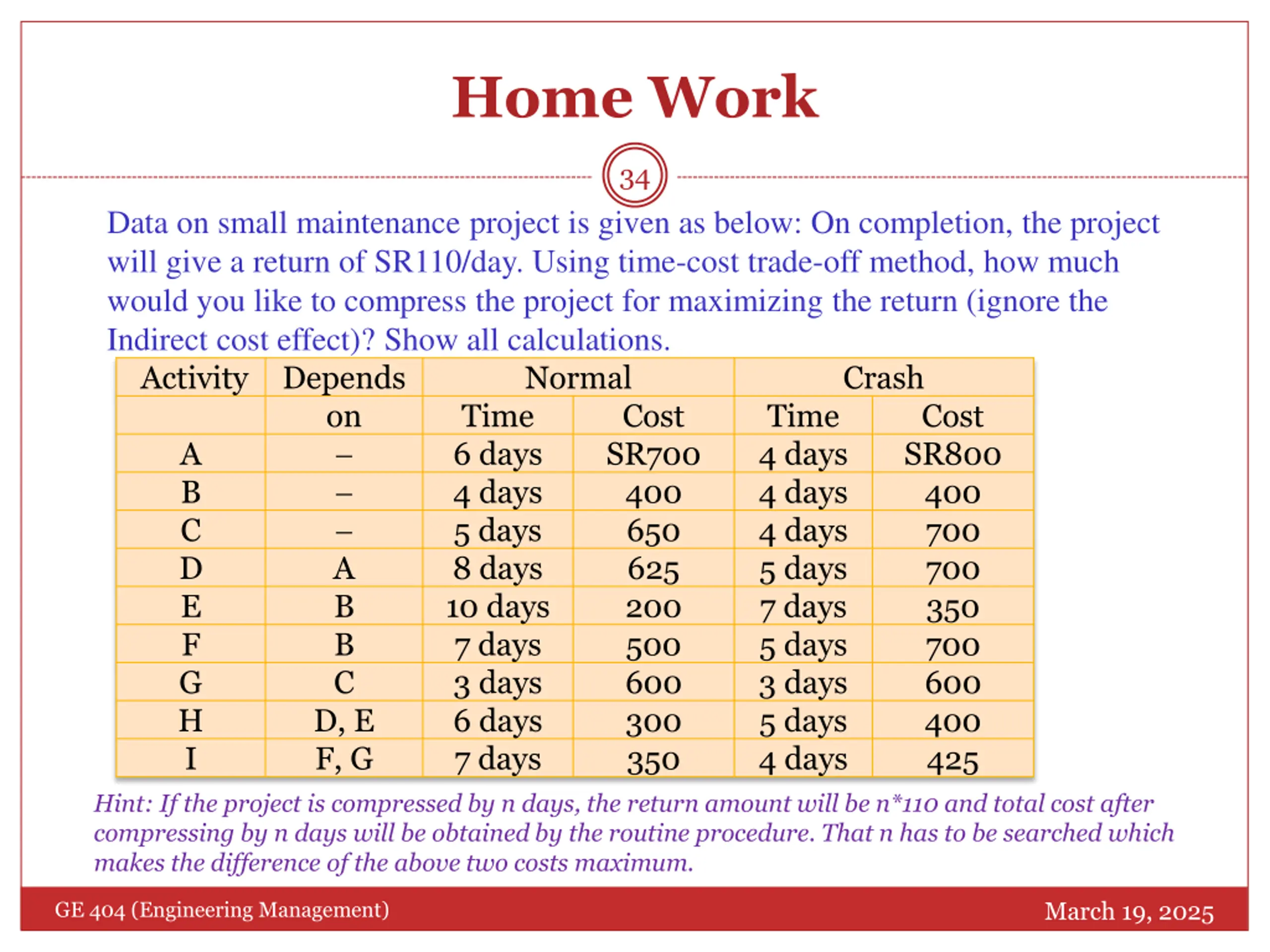Home Work 34 Data on small maintenance project is given as below: On completion, the project will give a return of SR110/day. Using time-cost trade-off method, how much would you like to compress the project for maximizing the return (ignore the Indirect cost effect)? Show all calculations. Activity Depends Normal on Time Cost A 6 days SR700 B 4 days 400 C 5 days 650 D A 8 days 625 E B 10 days 200 F B 7 days 500 G C 3 days 600 H D, E 6 days 300 I F, G 7 days 350 Crash Time 4 days 4 days 4 days 5 days 7 days 5 days 3 days 5 days 4 days Cost SR800 400 700 700 350 700 600 400 425 Hint: If the project is compressed by n days, the return amount will be n*110 and total cost after compressing by n days will be obtained by the routine procedure. That n has to be searched which makes the difference of the above two costs maximum. March 19, 2025 GE 404 (Engineering Management)