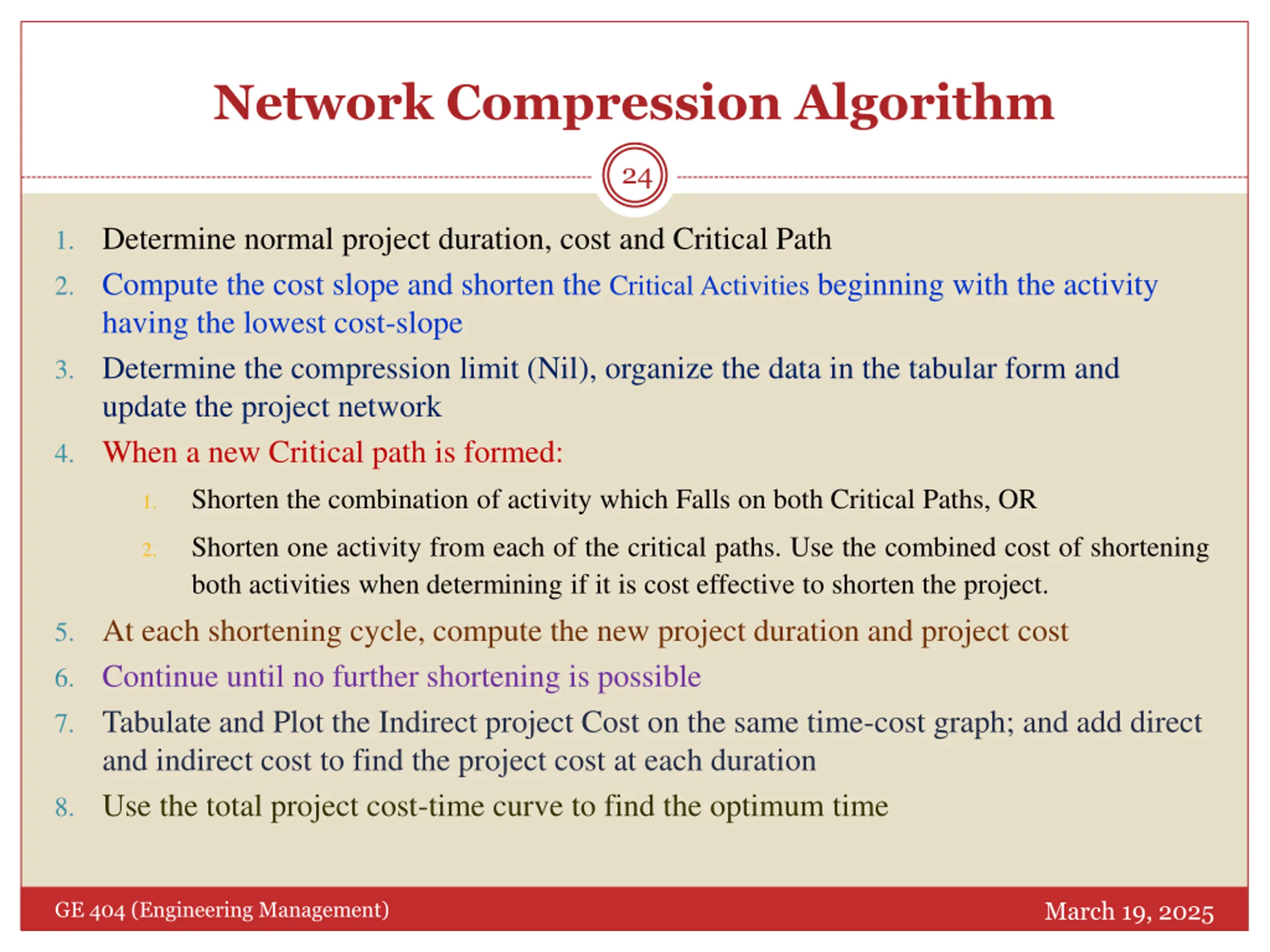 Network Compression Algorithm 24 1. Determine normal project duration, cost and Critical Path 2. Compute the cost slope and shorten the Critical Activities beginning with the activity having the lowest cost-slope 3. Determine the compression limit (Nil), organize the data in the tabular form and update the project network 4. When a new Critical path is formed: Shorten the combination of activity which Falls on both Critical Paths, OR 1. Shorten one activity from each of the critical paths. Use the combined cost of shortening both activities when determining if it is cost effective to shorten the project. 5. At each shortening cycle, compute the new project duration and project cost 6. Continue until no further shortening is possible 7. Tabulate and Plot the Indirect project Cost on the same time-cost graph; and add direct and indirect cost to find the project cost at each duration 8. Use the total project cost-time curve to find the optimum time 2. March 19, 2025 GE 404 (Engineering Management)