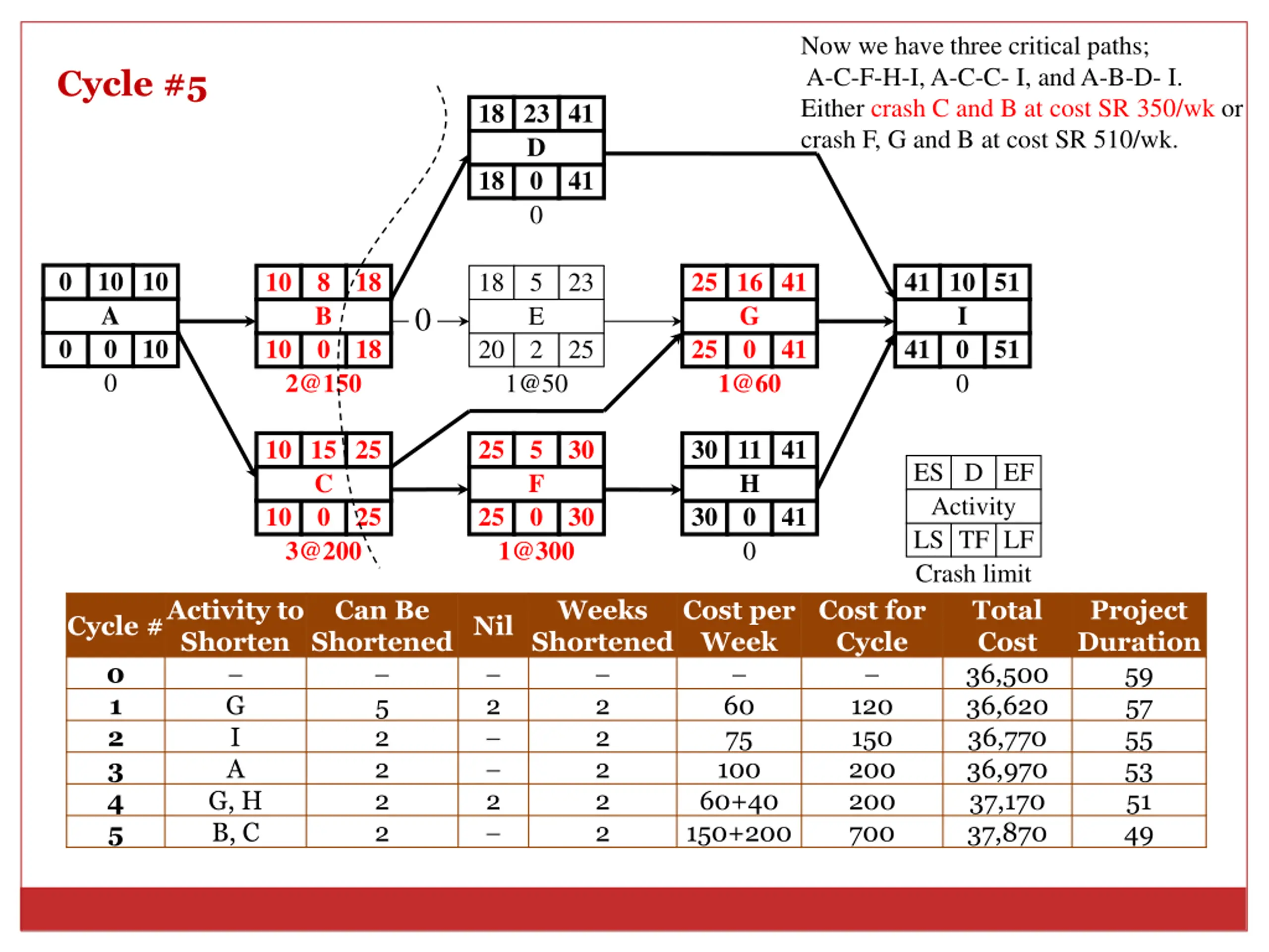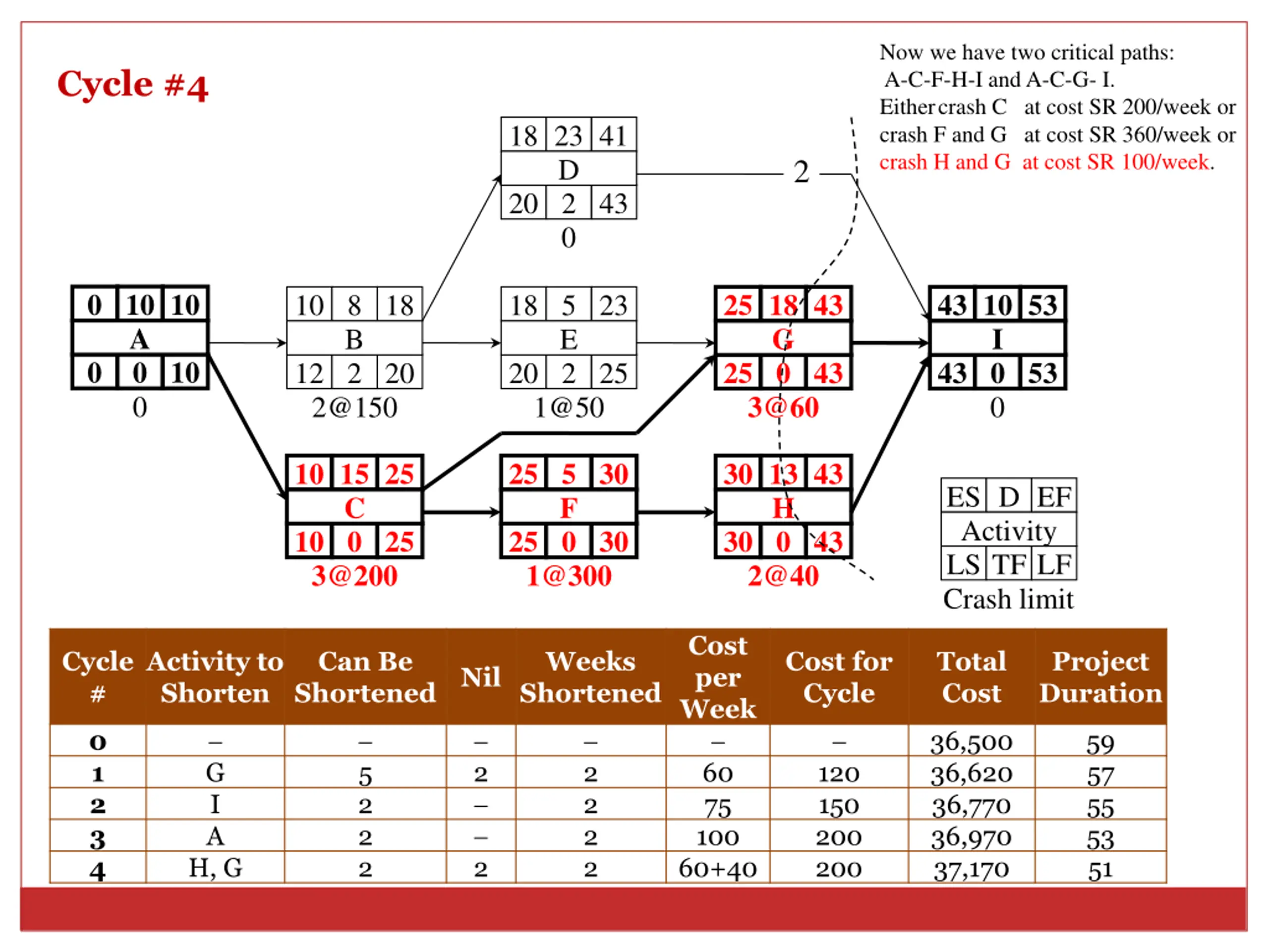Now we have three critical paths; A-C-F-H-I, A-C-C- I, and A-B-D- I. Either crash C and B at cost SR 350/wk or crash F, G and B at cost SR 510/wk. Cycle #5 18 23 41 D 18 0 41 0 0 10 10 A 10 8 B 18 25 16 41 G 41 10 51 I 18 5 E 23 0 0 0 10 10 0 18 25 0 41 41 0 51 20 2 25 2@150 1@60 0 1@50 0 10 15 25 C 25 5 F 30 30 11 41 H ES D EF Activity 10 0 25 25 0 30 30 0 41 LS TF LF Crash limit Total Cost 36,500 36,620 36,770 36,970 37,170 37,870 3@200 1@300 0 Cycle #Activity to Shorten 0 1 2 3 4 5 Can Be Shortened 5 2 2 2 2 Weeks Shortened 2 2 2 2 2 Cost per Week 60 75 100 60+40 150+200 Cost for Cycle 120 150 200 200 700 Project Duration 59 57 55 53 51 49 Nil G I A 2 2 G, H B, C