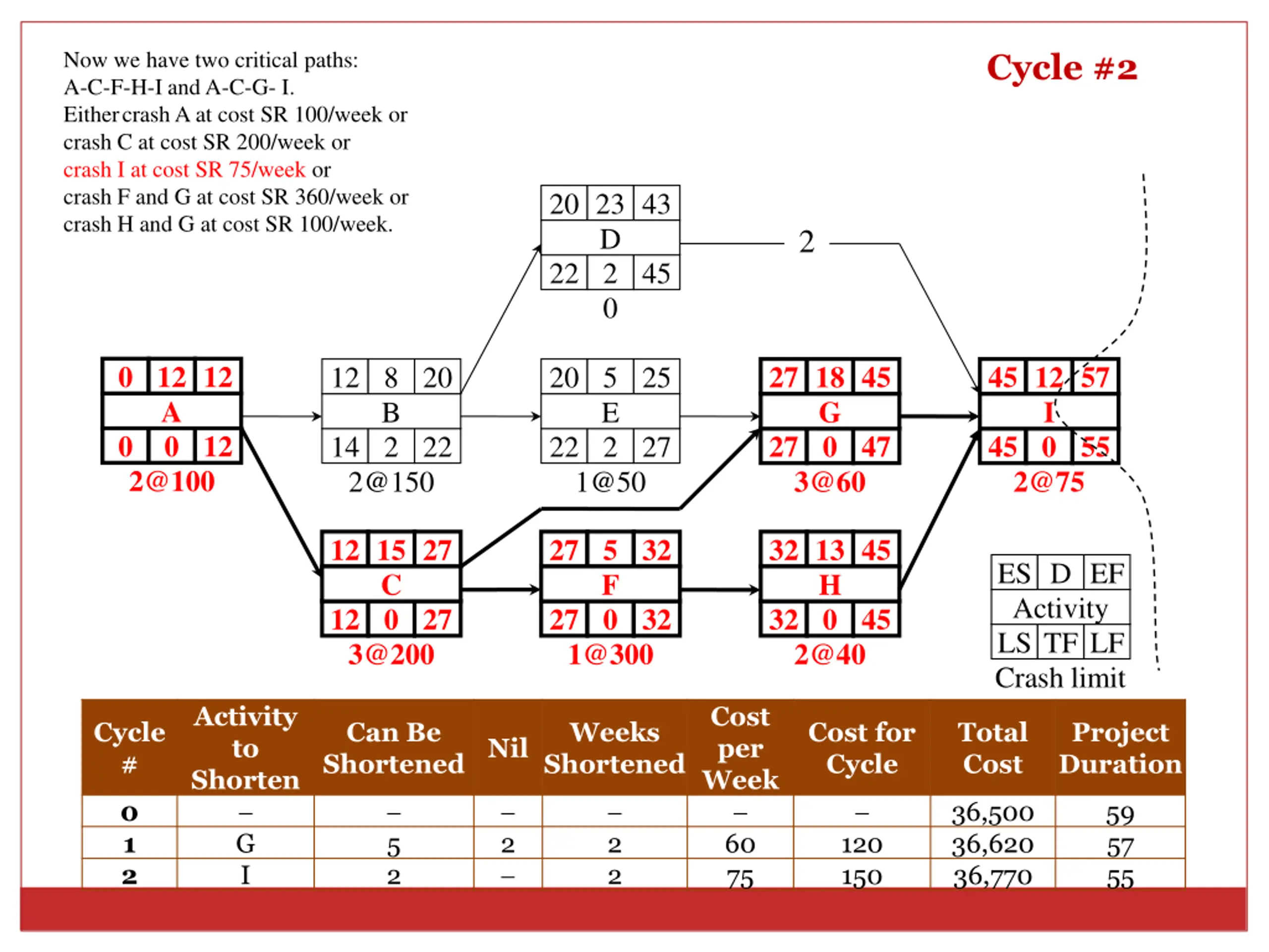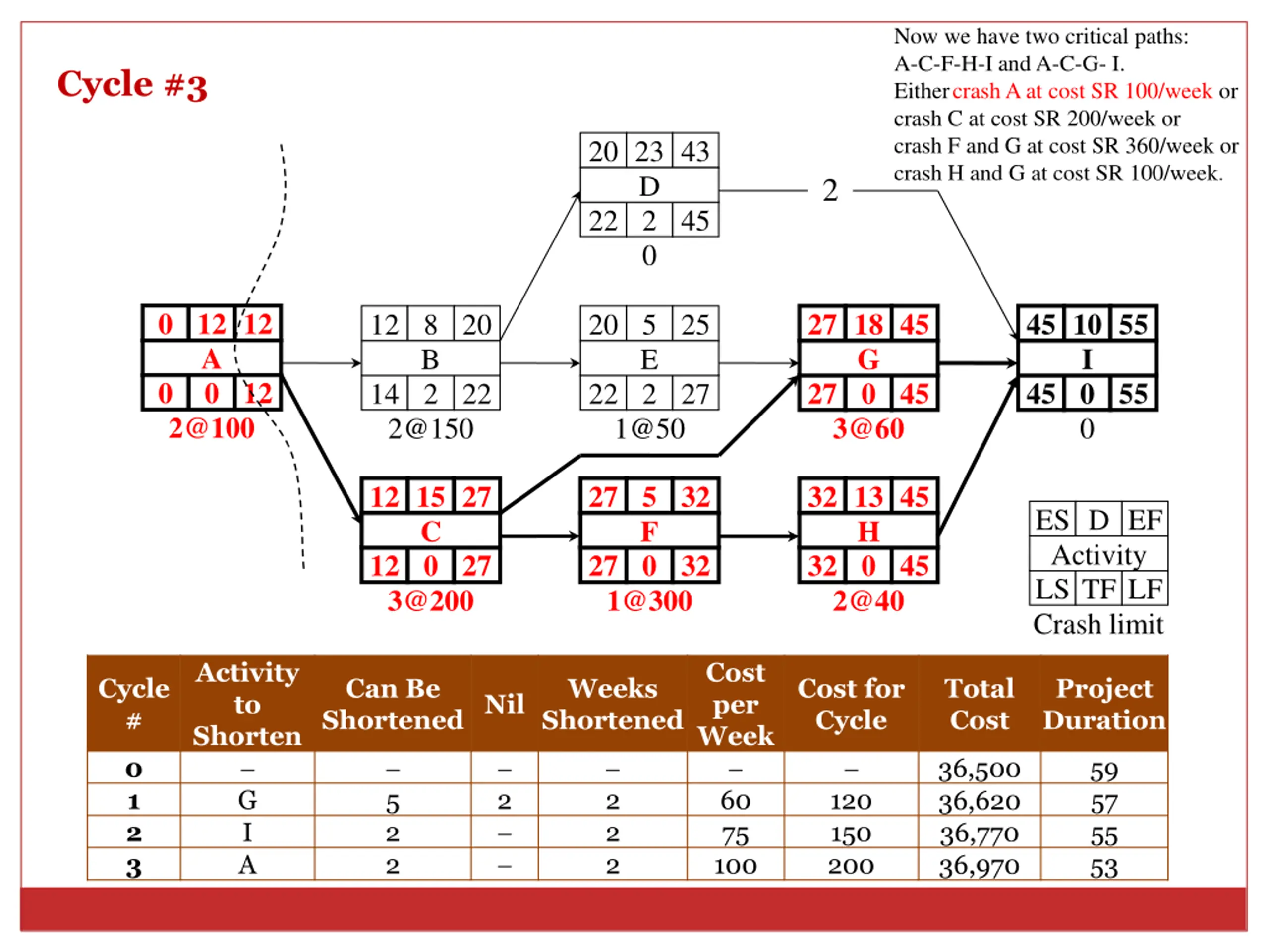 Now we have two critical paths: A-C-F-H-I and A-C-G- I. Either crash A at cost SR 100/week or crash C at cost SR 200/week or crash I at cost SR 75/week or crash F and G at cost SR 360/week or crash H and G at cost SR 100/week. Cycle #2 20 23 43 D 2 22 2 45 0 0 12 12 A 27 18 45 G 45 12 57 I 12 8 20 B 20 5 25 E 0 0 12 27 0 47 45 0 55 14 2 22 22 2 27 2@100 3@60 2@75 2@150 1@50 12 15 27 C 27 5 32 F 32 13 45 H ES D EF Activity 12 0 27 27 0 32 32 0 45 LS TF LF Crash limit 3@200 1@300 2@40 Activity to Shorten G I Cost per Week 60 75 Cycle # Can Be Shortened Weeks Shortened Cost for Cycle Total Cost Project Duration Nil 5 2 2 2 2 0 1 2 36,500 36,620 36,770 59 57 55 120 150