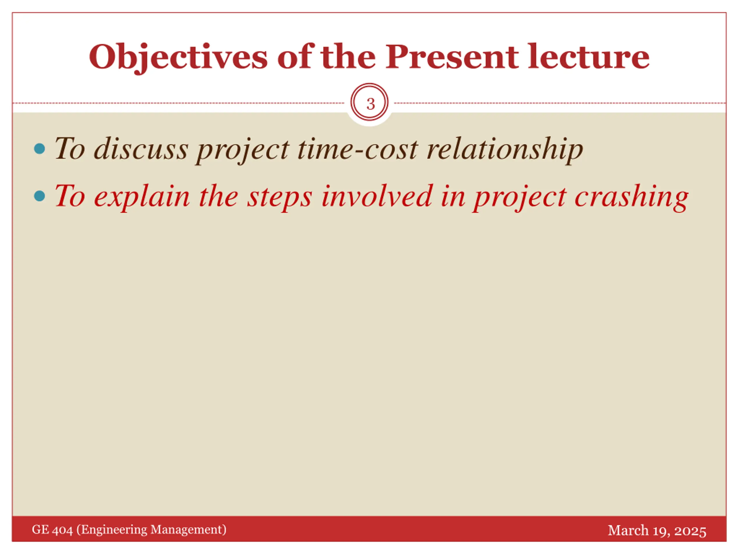 Objectives of the Present lecture 3 To discuss project time-cost relationship To explain the steps involved in project crashing March 19, 2025 GE 404 (Engineering Management)