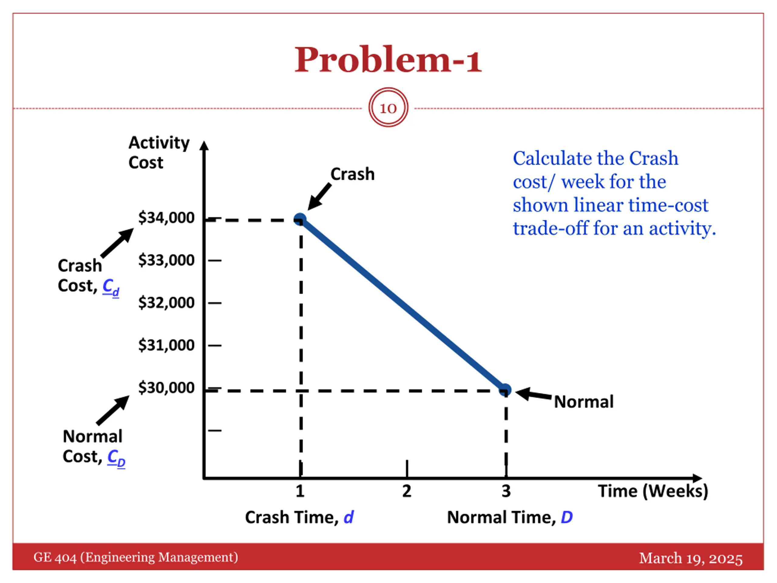 Problem-1 10 Activity Cost Calculate the Crash cost/ week for the shown linear time-cost trade-off for an activity. Crash $34,000 $33,000 Crash Cost, Cd $32,000 $31,000 $30,000 Normal Normal Cost, CD | 1 | 2 | 3 Time (Weeks) Crash Time, d Normal Time, D March 19, 2025 GE 404 (Engineering Management)