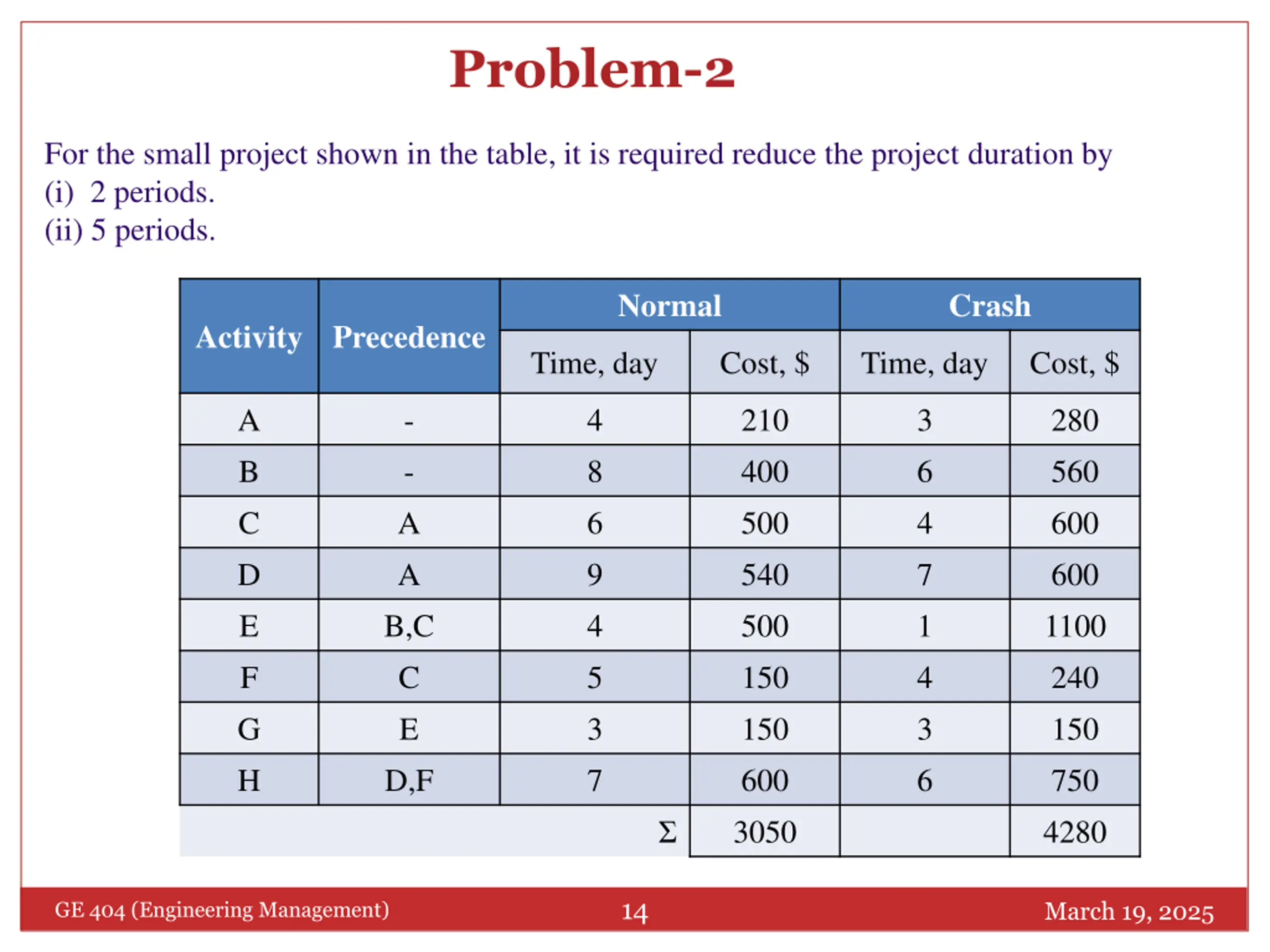 Problem-2 For the small project shown in the table, it is required reduce the project duration by (i) 2 periods. (ii) 5 periods. Normal Crash Activity Precedence Time, day Cost, $ Time, day Cost, $ A B C D E F G H - - 4 8 6 9 4 5 3 7 210 400 500 540 500 150 150 600 3050 3 6 4 7 1 4 3 6 280 560 600 600 1100 240 150 750 4280 A A B,C C E D,F 14 March 19, 2025 GE 404 (Engineering Management)