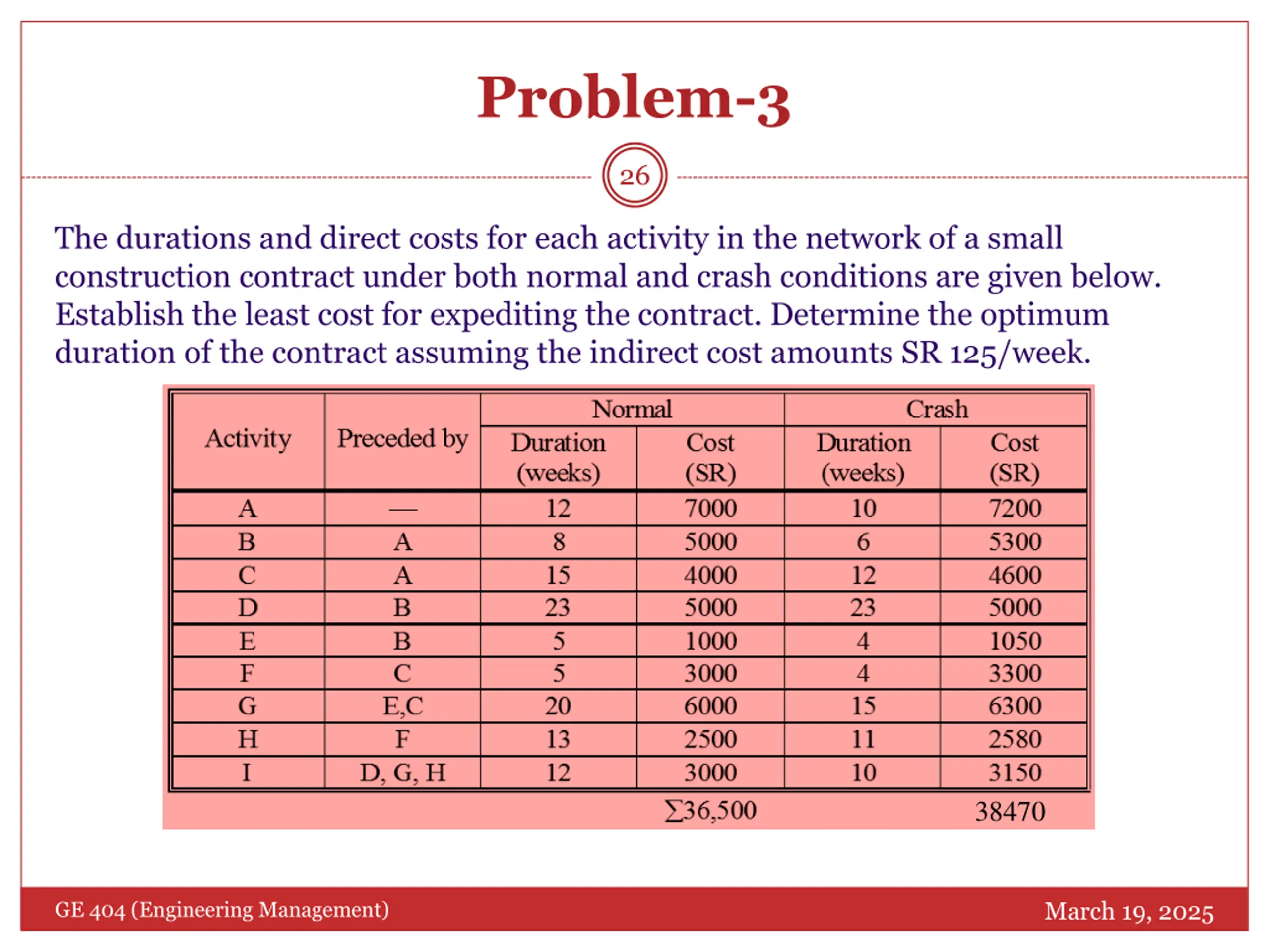 Problem-3 26 The durations and direct costs for each activity in the network of a small construction contract under both normal and crash conditions are given below. Establish the least cost for expediting the contract. Determine the optimum duration of the contract assuming the indirect cost amounts SR 125/week. 38470 March 19, 2025 GE 404 (Engineering Management)