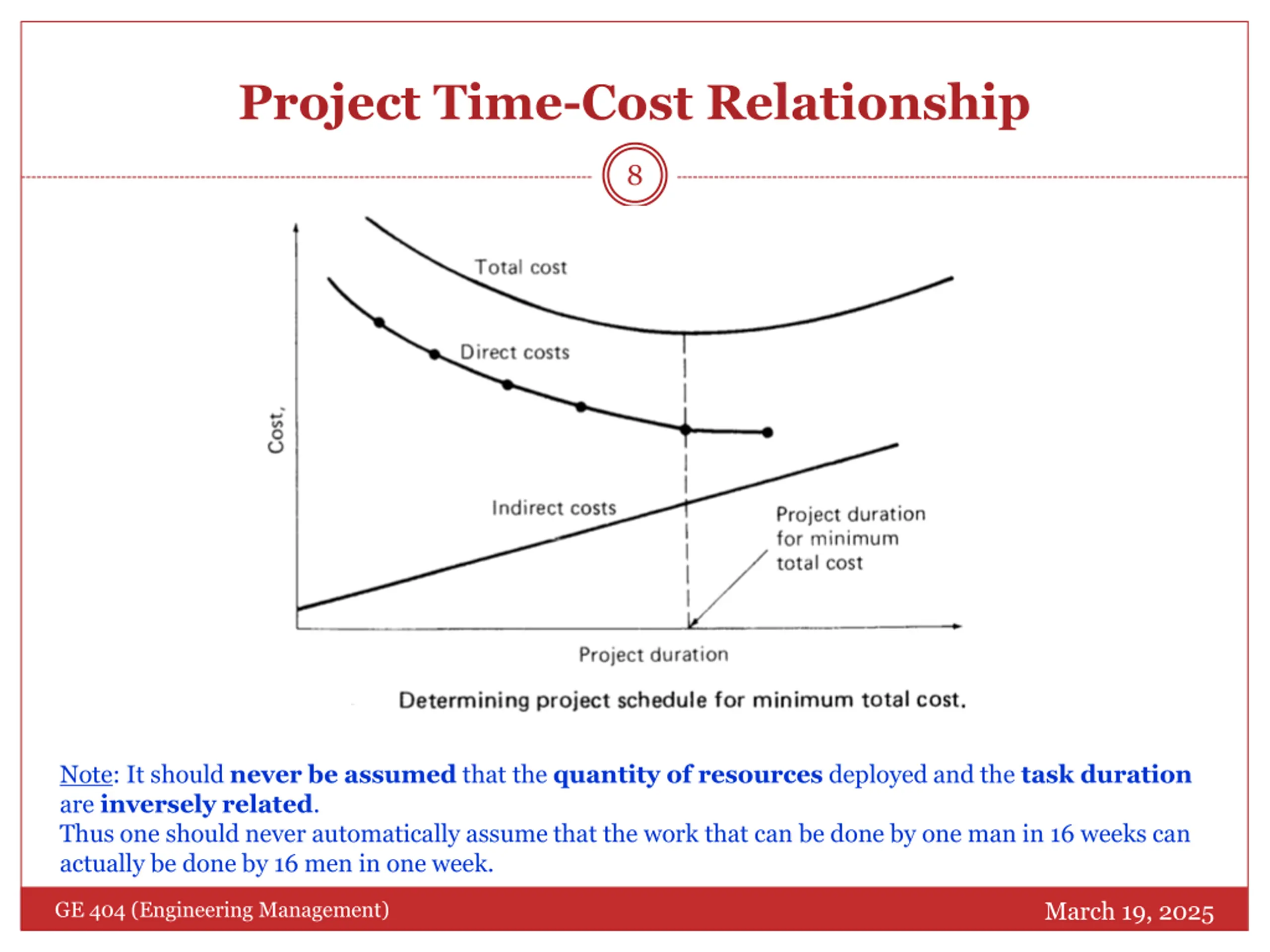 Project Time-Cost Relationship 8 Note: It should never be assumed that the quantity of resources deployed and the task duration are inversely related. Thus one should never automatically assume that the work that can be done by one man in 16 weeks can actually be done by 16 men in one week. March 19, 2025 GE 404 (Engineering Management)