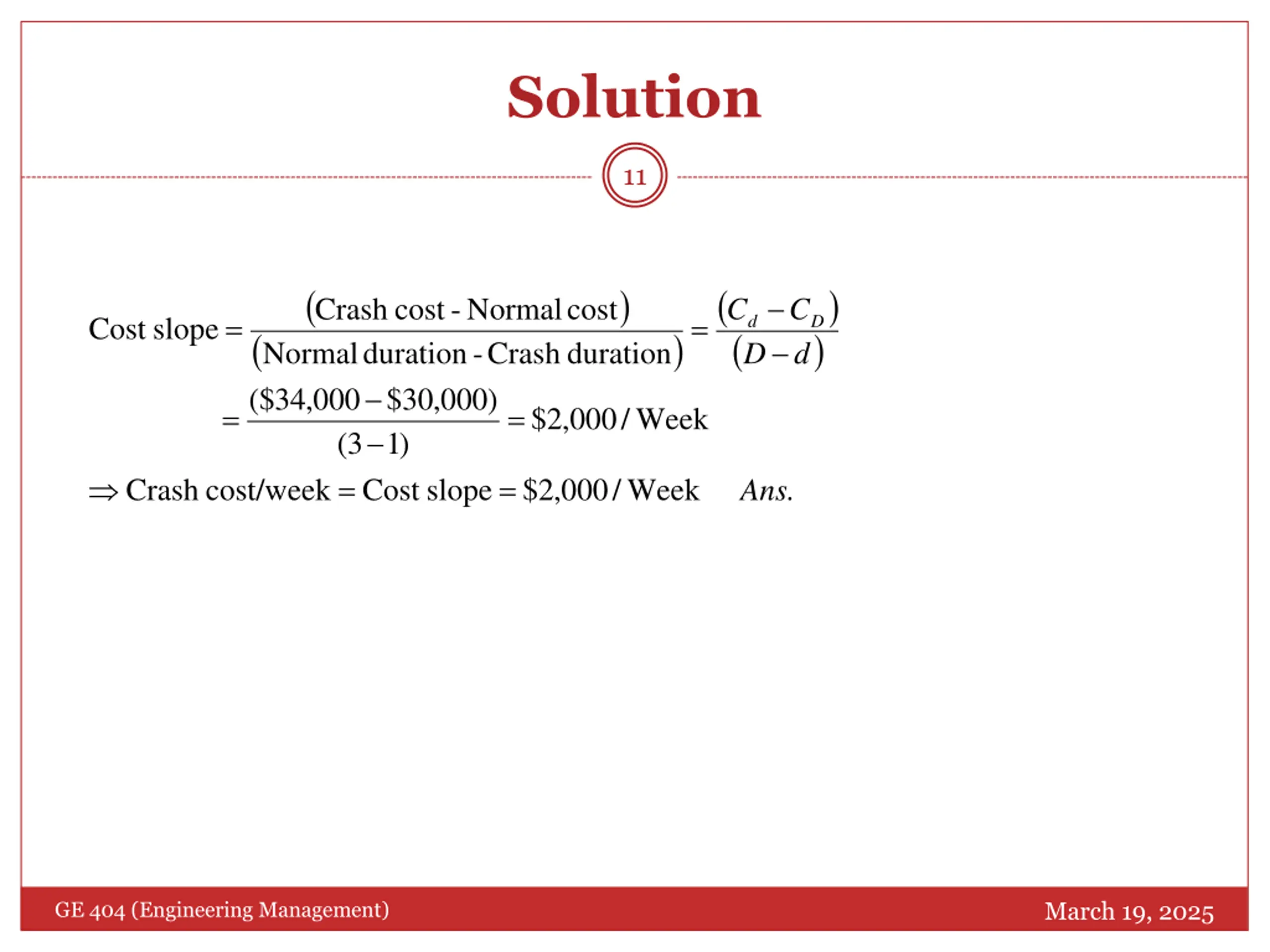 Solution 11 ( ) ( ) Crash cost - Normal cost C C = = Cost slope d D ( ($ ) ( ) Normal duration - Crash duration D d 34 000 , 30 $ 000 , ) = = , 2 $ 000 / Week ) 1 3 ( = = Crash cost/week Cost slope , 2 $ 000 / Week Ans. March 19, 2025 GE 404 (Engineering Management)