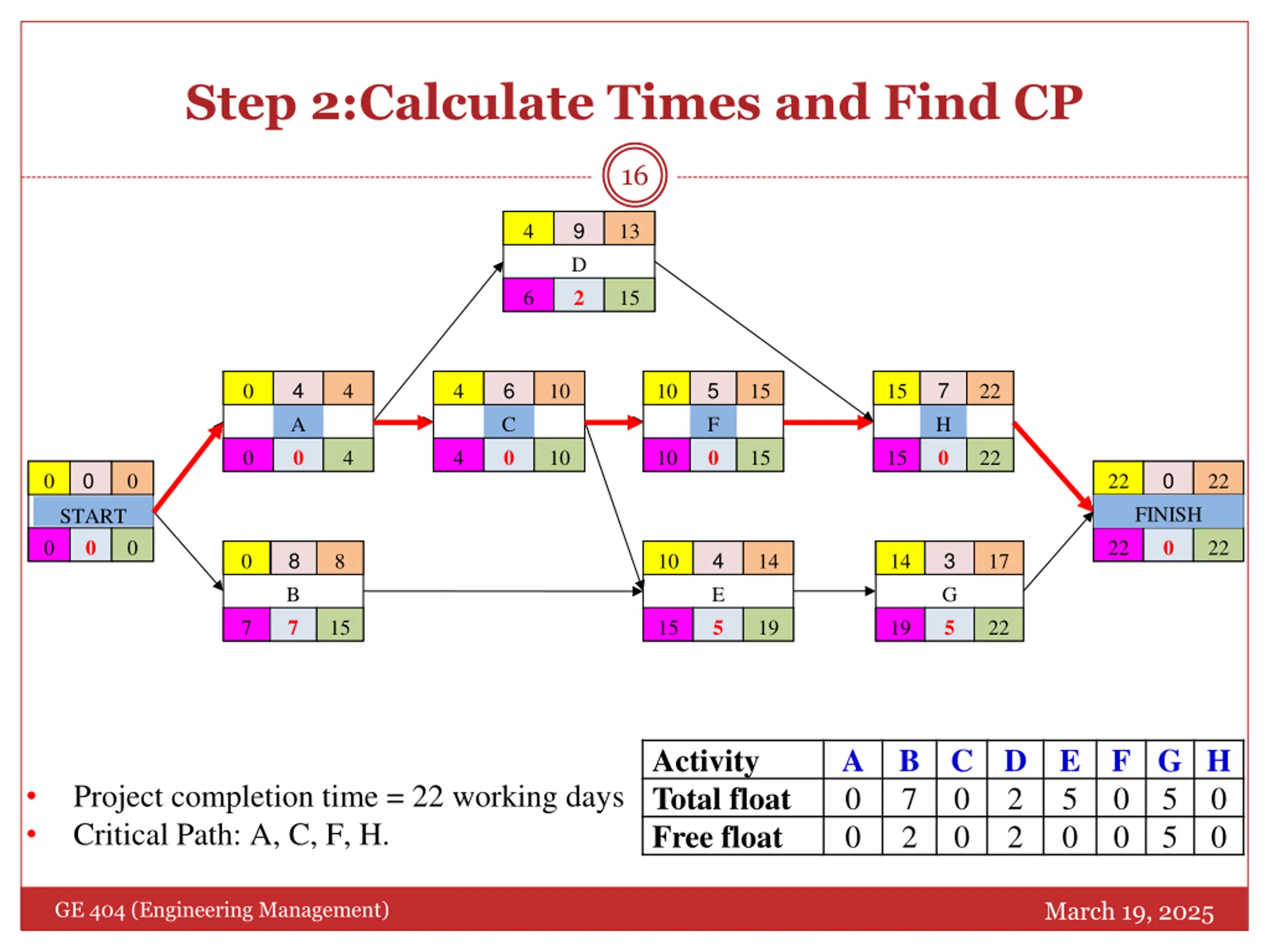 Step 2:Calculate Times and Find CP 16 9 4 13 D 2 6 15 4 6 5 7 0 4 4 10 10 15 15 22 A 0 C 0 F 0 H 0 0 4 4 10 10 15 15 22 0 0 0 0 22 22 FINISH START 0 0 0 0 22 22 8 4 3 0 8 10 14 14 17 B 7 E 5 G 5 7 15 15 19 19 22 Activity Total float Free float A 0 0 B 7 2 C 0 0 D 2 2 E 5 0 F G H 0 5 0 5 Project completion time = 22 working days Critical Path: A, C, F, H. 0 0 March 19, 2025 GE 404 (Engineering Management)