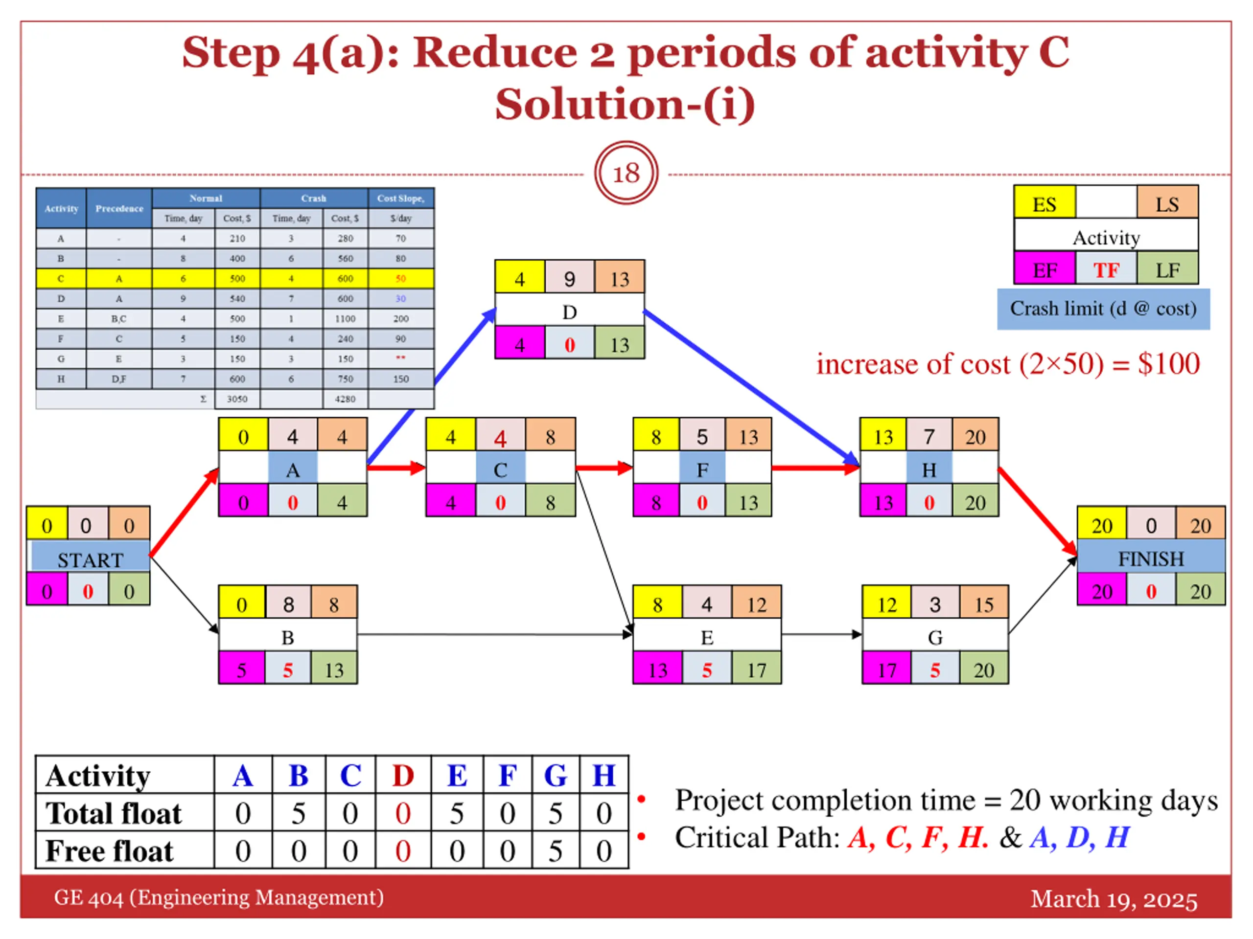 Step 4(b): Reduce 1 period of activity A 19 Increase of cost = $70 9 3 12 D 0 3 12 4 5 7 3 0 3 3 7 7 12 12 19 A 0 C 0 F 0 H 0 0 3 3 7 7 12 12 19 0 0 0 0 19 19 FINISH START 0 0 0 0 19 19 8 4 3 0 8 7 11 11 14 B 4 E 5 G 5 8 12 12 16 16 19 Activity Total float Free float A 0 0 B 4 0 C 0 0 D 0 0 E 5 0 F G H 0 5 0 5 Project completion time = 19 working days Critical Path: A, C, F, H. & A, D, H 0 0 March 19, 2025 GE 404 (Engineering Management)