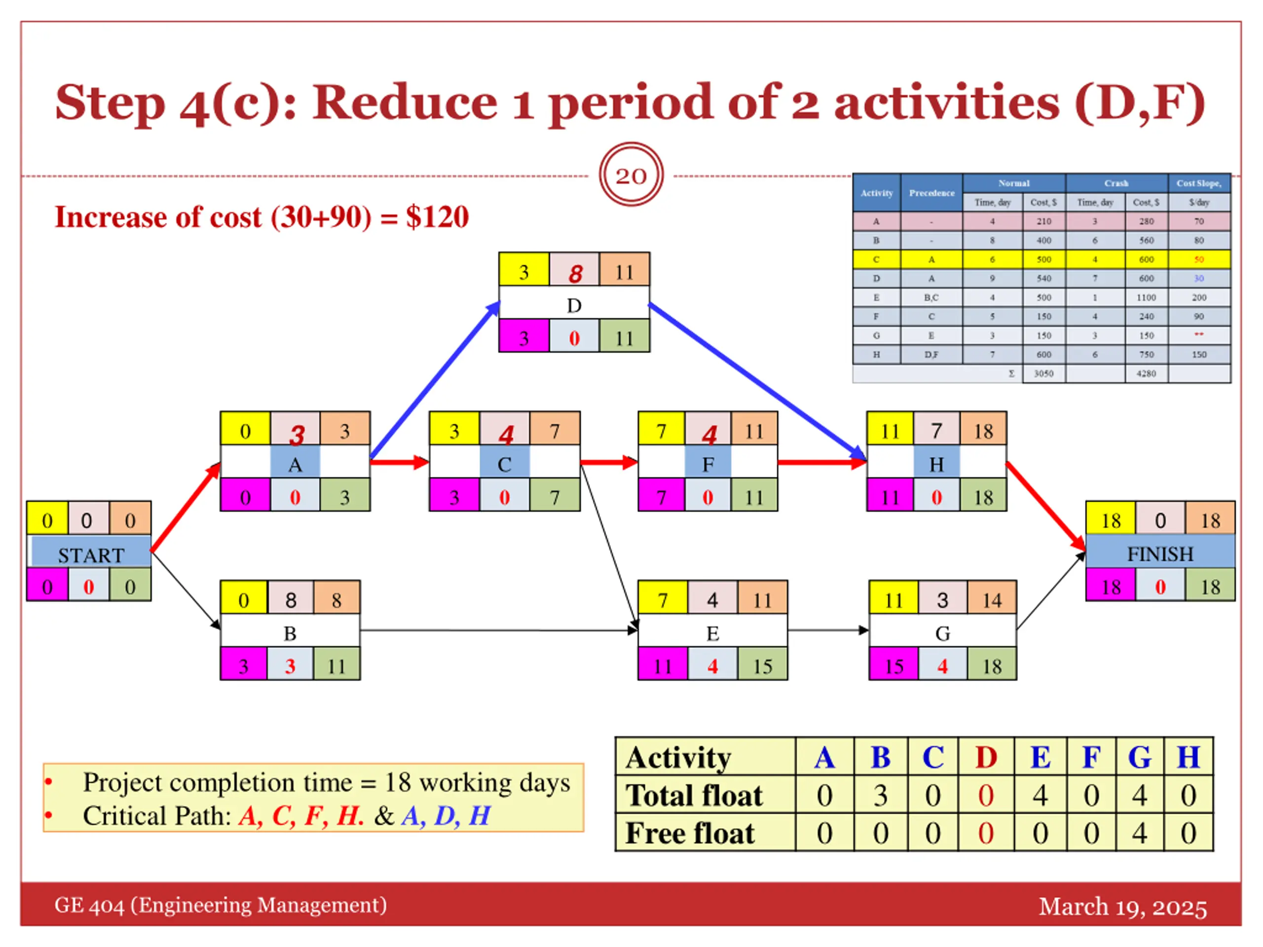 Step 4(c): Reduce 1 period of 2 activities (D,F) 20 Increase of cost (30+90) = $120 8 3 11 D 0 3 11 7 3 4 4 0 3 3 7 7 11 11 18 A 0 C 0 F 0 H 0 0 3 3 7 7 11 11 18 0 0 0 0 18 18 FINISH START 0 0 0 0 18 18 8 4 3 0 8 7 11 11 14 B 3 E 4 G 4 3 11 11 15 15 18 Activity Total float Free float A 0 0 B 3 0 C 0 0 D 0 0 E 4 0 F G H 0 4 0 4 Project completion time = 18 working days Critical Path: A, C, F, H. & A, D, H 0 0 March 19, 2025 GE 404 (Engineering Management)
