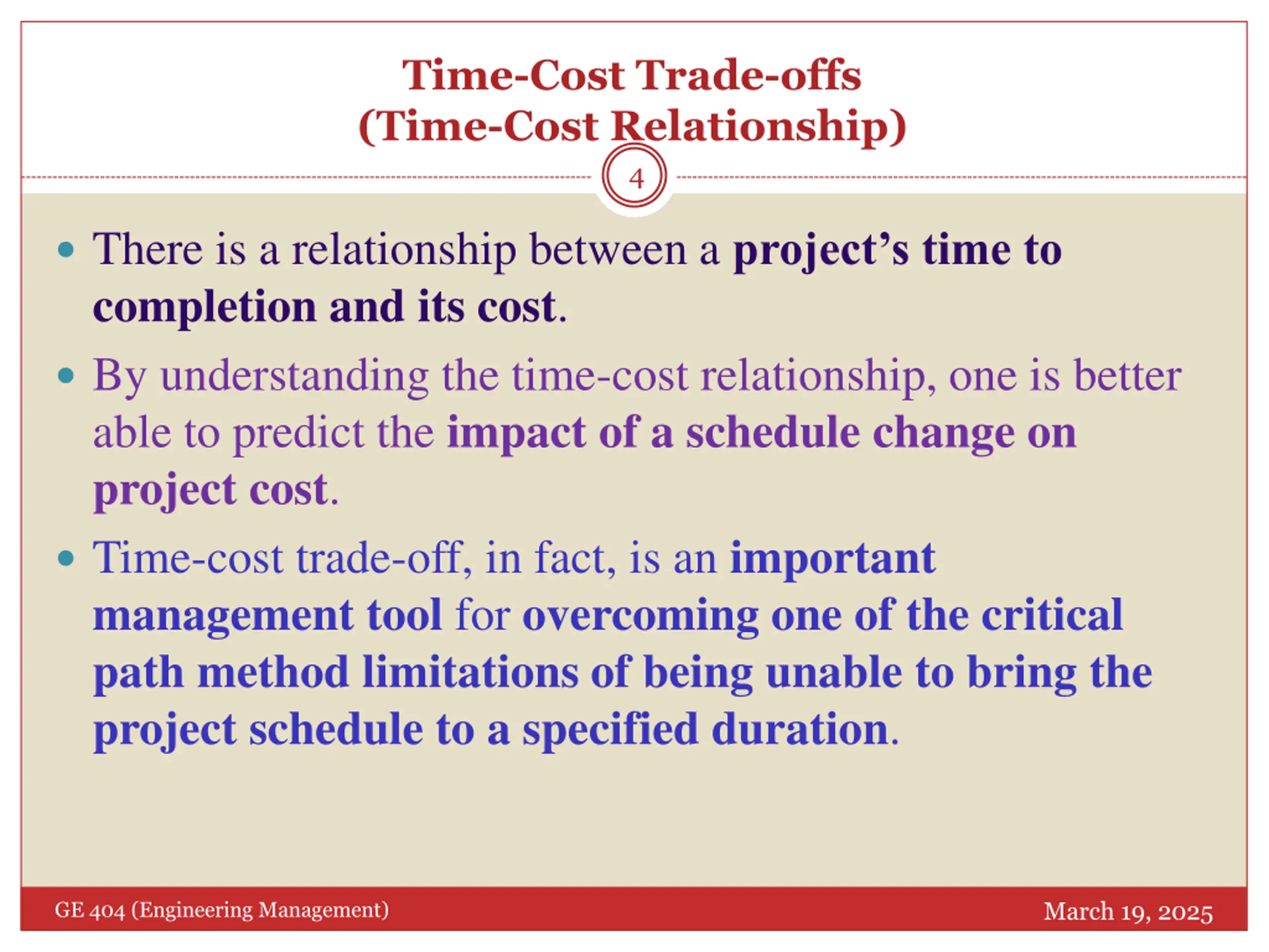 Time-Cost Trade-offs (Time-Cost Relationship) 4 There is a relationship between a project s time to completion and its cost. By understanding the time-cost relationship, one is better able to predict the impact of a schedule change on project cost. Time-cost trade-off, in fact, is an important management tool for overcoming one of the critical path method limitations of being unable to bring the project schedule to a specified duration. March 19, 2025 GE 404 (Engineering Management)