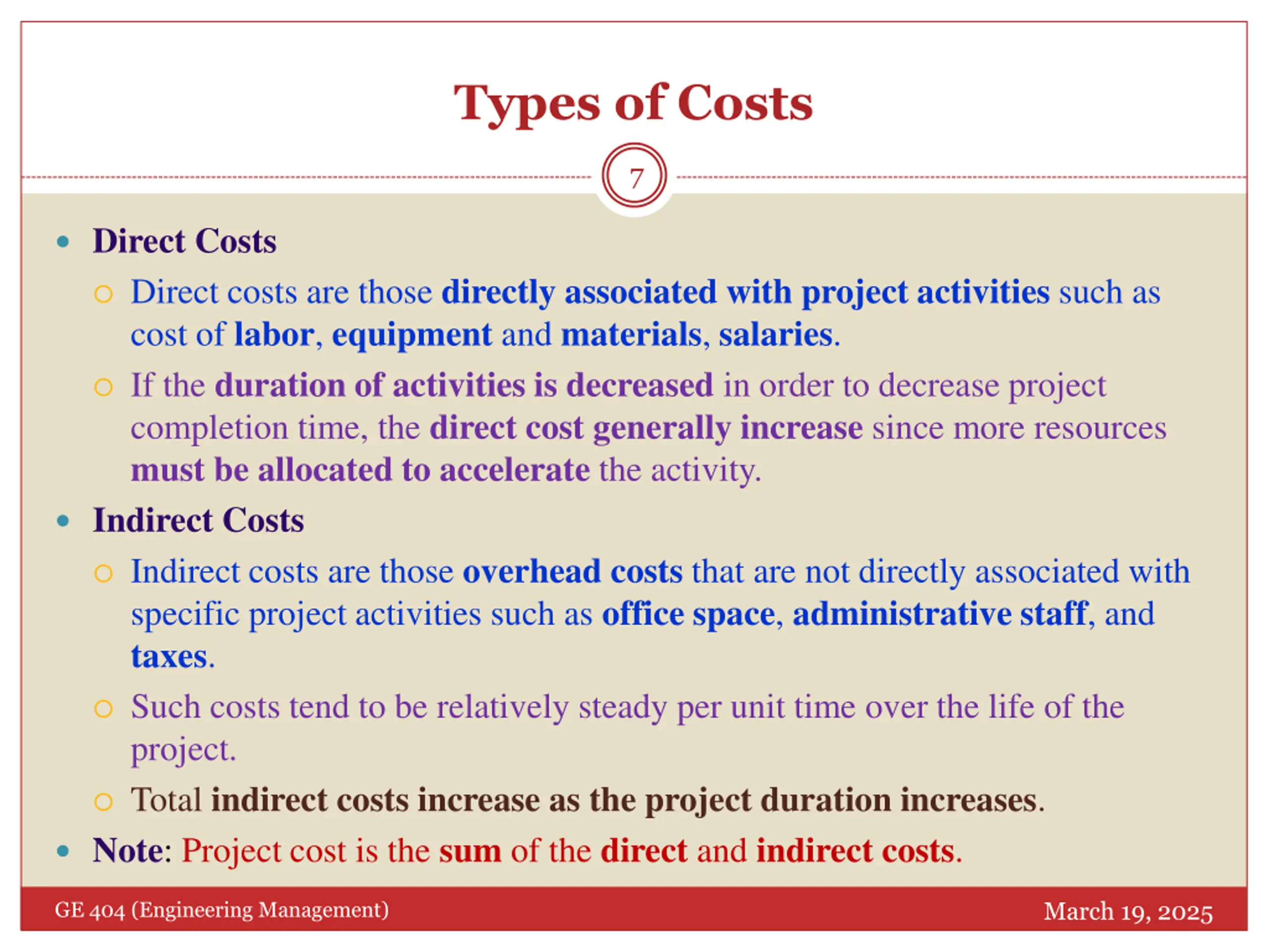Types of Costs 7 Direct Costs Direct costs are those directly associated with project activities such as cost of labor, equipment and materials, salaries. If the duration of activities is decreased in order to decrease project completion time, the direct cost generally increase since more resources must be allocated to accelerate the activity. Indirect Costs Indirect costs are those overhead costs that are not directly associated with specific project activities such as office space, administrative staff, and taxes. Such costs tend to be relatively steady per unit time over the life of the project. Total indirect costs increase as the project duration increases. Note: Project cost is the sum of the direct and indirect costs. March 19, 2025 GE 404 (Engineering Management)