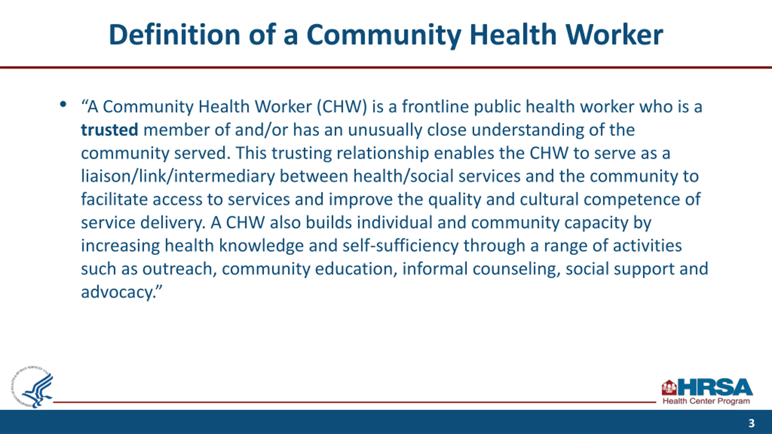 Definition of a Community Health Worker A Community Health Worker (CHW) is a frontline public health worker who is a trusted member of and/or has an unusually close understanding of the community served. This trusting relationship enables the CHW to serve as a liaison/link/intermediary between health/social services and the community to facilitate access to services and improve the quality and cultural competence of service delivery. A CHW also builds individual and community capacity by increasing health knowledge and self-sufficiency through a range of activities such as outreach, community education, informal counseling, social support and advocacy. 3