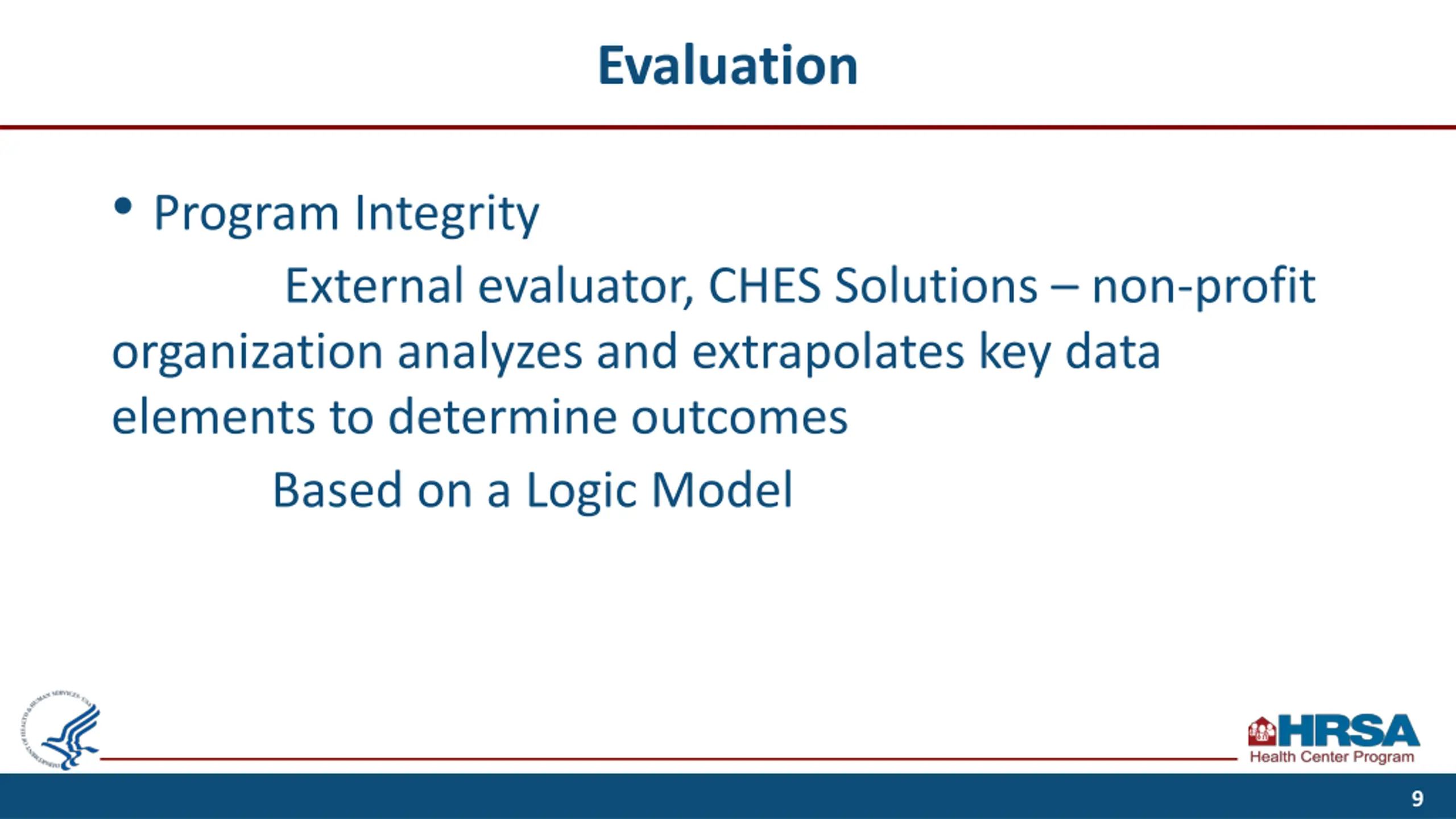Evaluation Program Integrity External evaluator, CHES Solutions non-profit organization analyzes and extrapolates key data elements to determine outcomes Based on a Logic Model 9