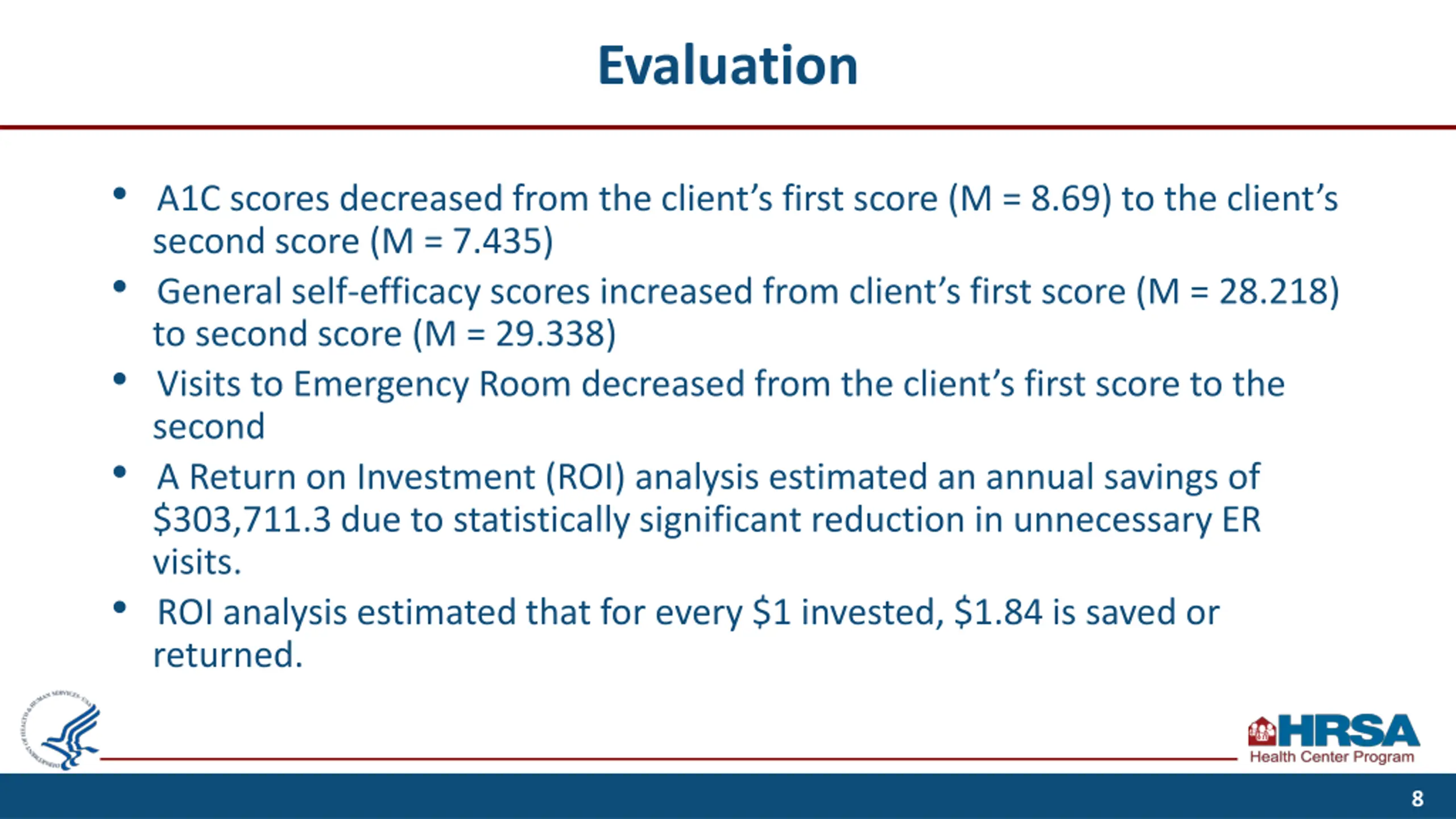 Evaluation A1C scores decreased from the client s first score (M = 8.69) to the client s second score (M = 7.435) General self-efficacy scores increased from client s first score (M = 28.218) to second score (M = 29.338) Visits to Emergency Room decreased from the client s first score to the second A Return on Investment (ROI) analysis estimated an annual savings of $303,711.3 due to statistically significant reduction in unnecessary ER visits. ROI analysis estimated that for every $1 invested, $1.84 is saved or returned. 8