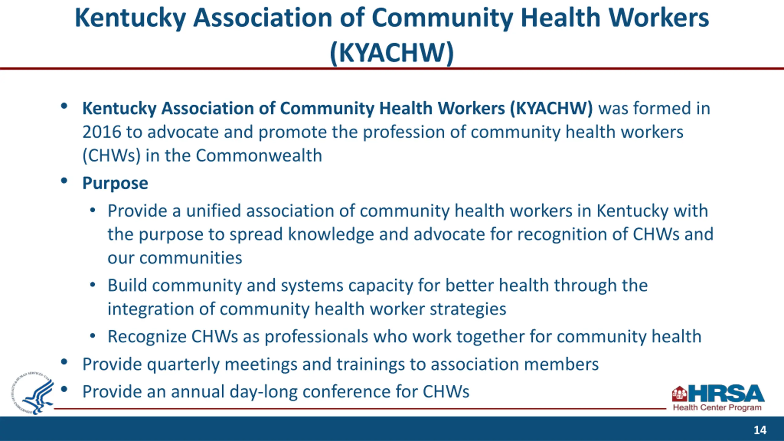 Kentucky Association of Community Health Workers (KYACHW) Kentucky Association of Community Health Workers (KYACHW) was formed in 2016 to advocate and promote the profession of community health workers (CHWs) in the Commonwealth Purpose Provide a unified association of community health workers in Kentucky with the purpose to spread knowledge and advocate for recognition of CHWs and our communities Build community and systems capacity for better health through the integration of community health worker strategies Recognize CHWs as professionals who work together for community health Provide quarterly meetings and trainings to association members Provide an annual day-long conference for CHWs 14