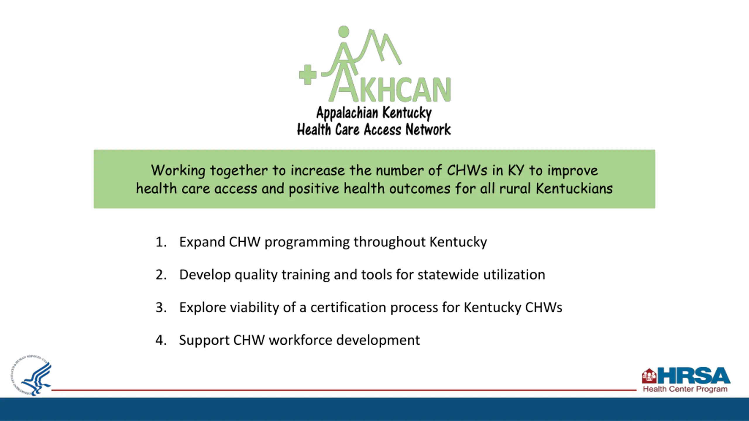 Working together to increase the number of CHWs in KY to improve health care access and positive health outcomes for all rural Kentuckians 1. Expand CHW programming throughout Kentucky 2. Develop quality training and tools for statewide utilization 3. Explore viability of a certification process for Kentucky CHWs 4. Support CHW workforce development