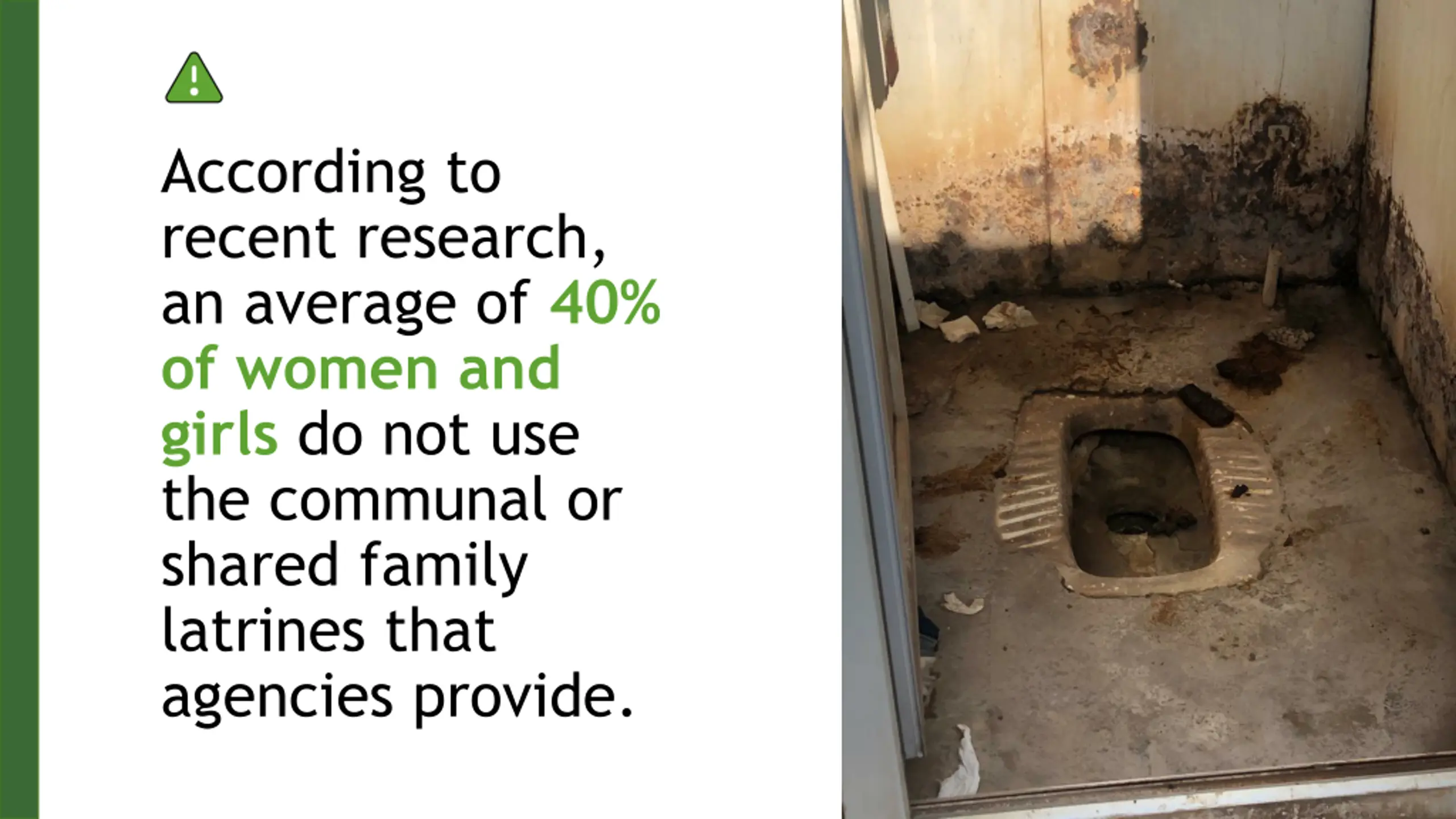 According to recent research, an average of 40% of women and girls do not use the communal or shared family latrines that agencies provide.