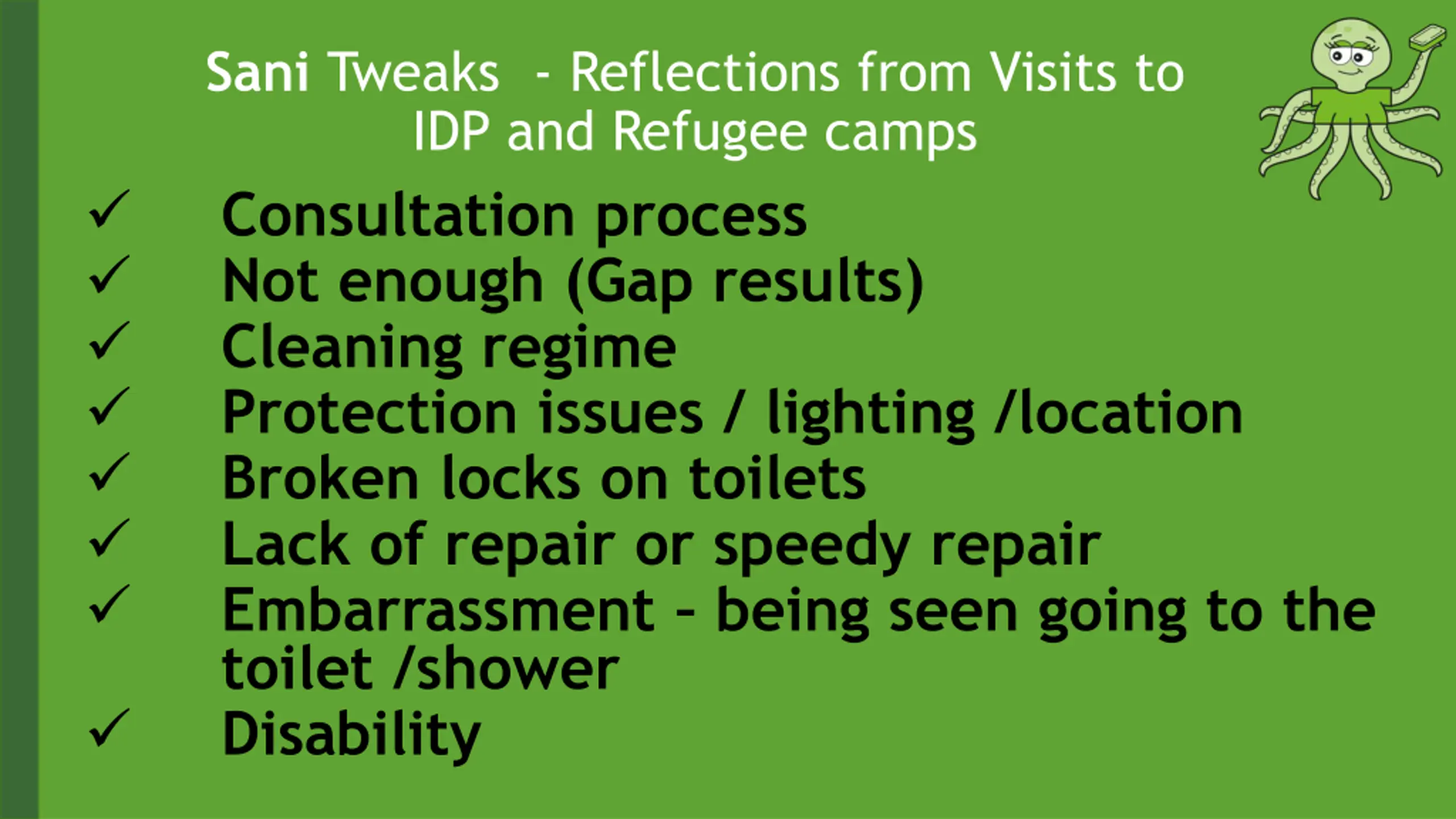 Sani Tweaks - Reflections from Visits to IDP and Refugee camps Consultation process Not enough (Gap results) Cleaning regime Protection issues / lighting /location Broken locks on toilets Lack of repair or speedy repair Embarrassment being seen going to the toilet /shower Disability