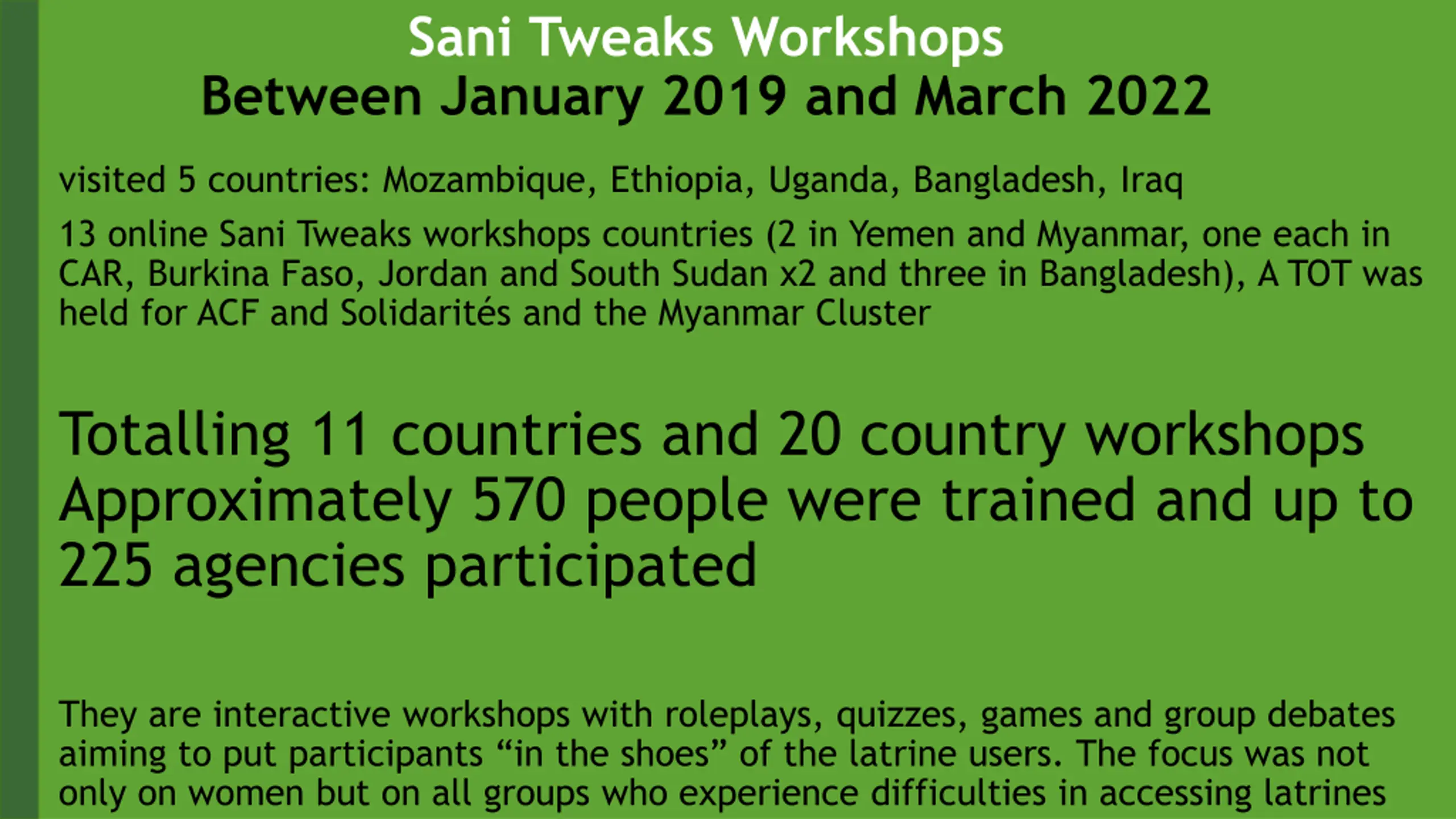 Sani Tweaks Workshops Between January 2019 and March 2022 visited 5 countries: Mozambique, Ethiopia, Uganda, Bangladesh, Iraq 13 online Sani Tweaks workshops countries (2 in Yemen and Myanmar, one each in CAR, Burkina Faso, Jordan and South Sudan x2 and three in Bangladesh), A TOT was held for ACF and Solidarit s and the Myanmar Cluster Totalling 11 countries and 20 country workshops Approximately 570 people were trained and up to 225 agencies participated They are interactive workshops with roleplays, quizzes, games and group debates aiming to put participants in the shoes of the latrine users. The focus was not only on women but on all groups who experience difficulties in accessing latrines
